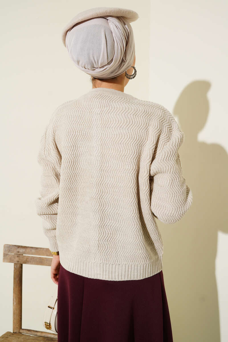 كارديغان محبوك باللون البيج مع أزرار ذهبية ونقشة متعرجة