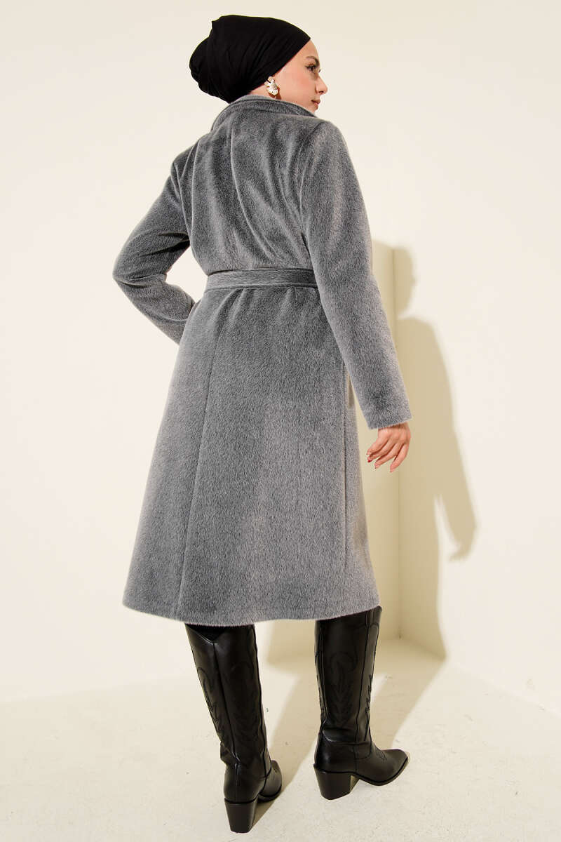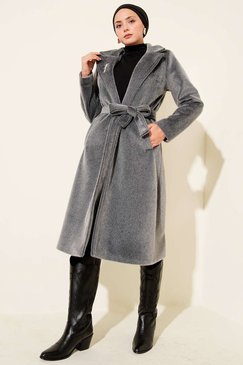 معطف صوف مزين بتفاصيل بروكيد مع حزام باللون الرمادي