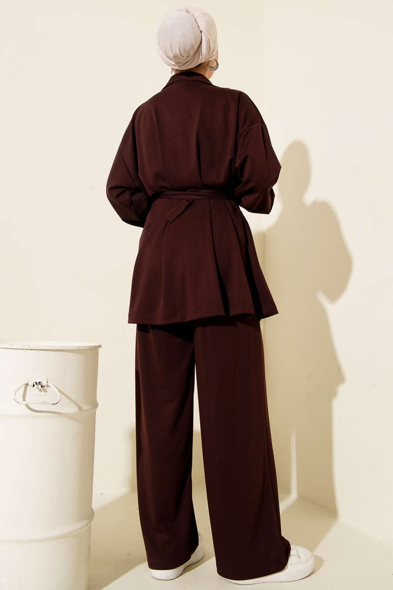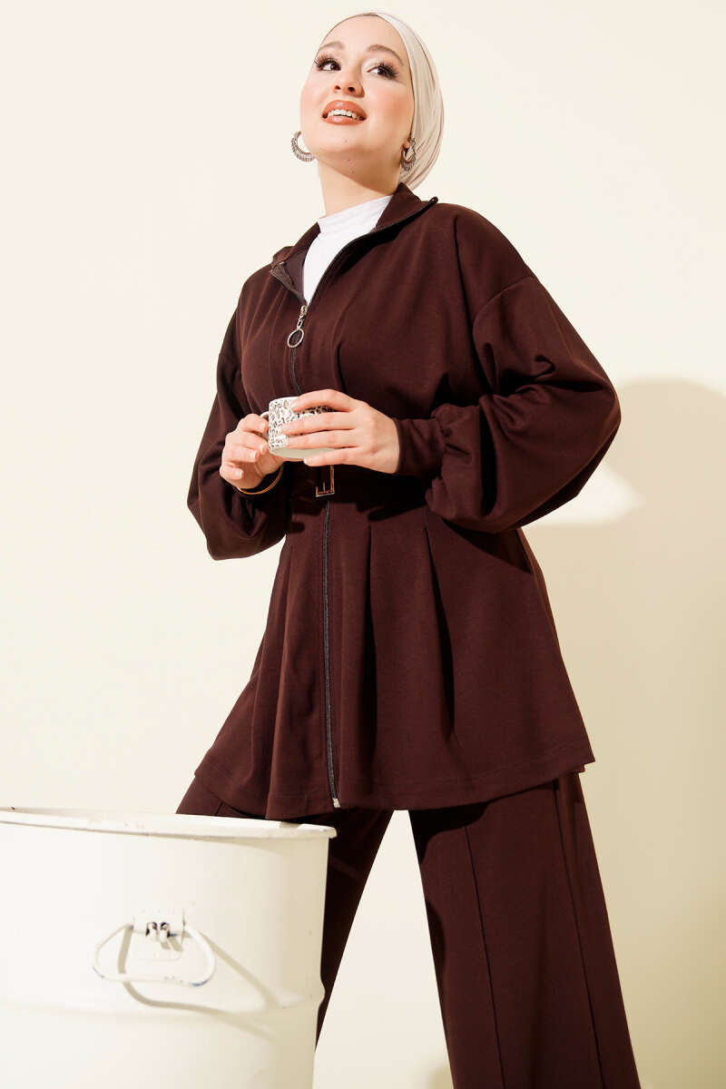 طقم أويشو مزود بحزام وسحّاب باللون البني