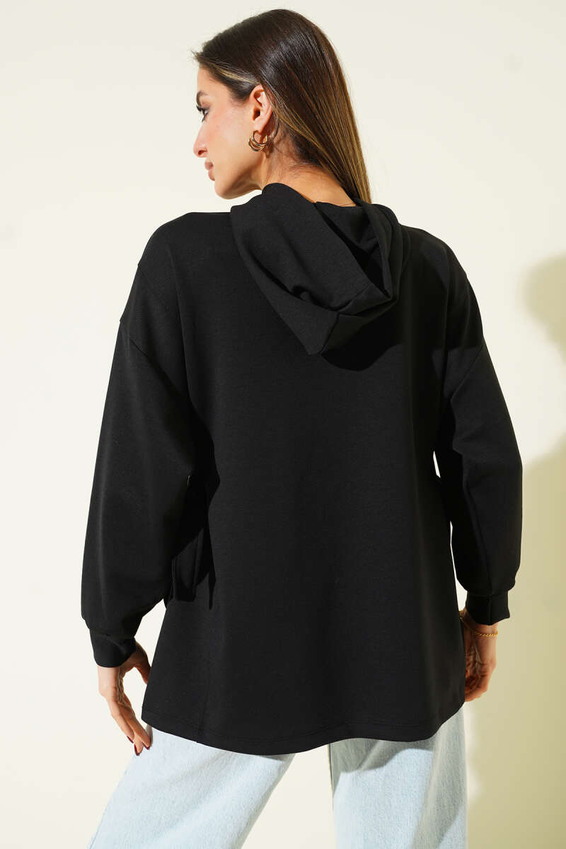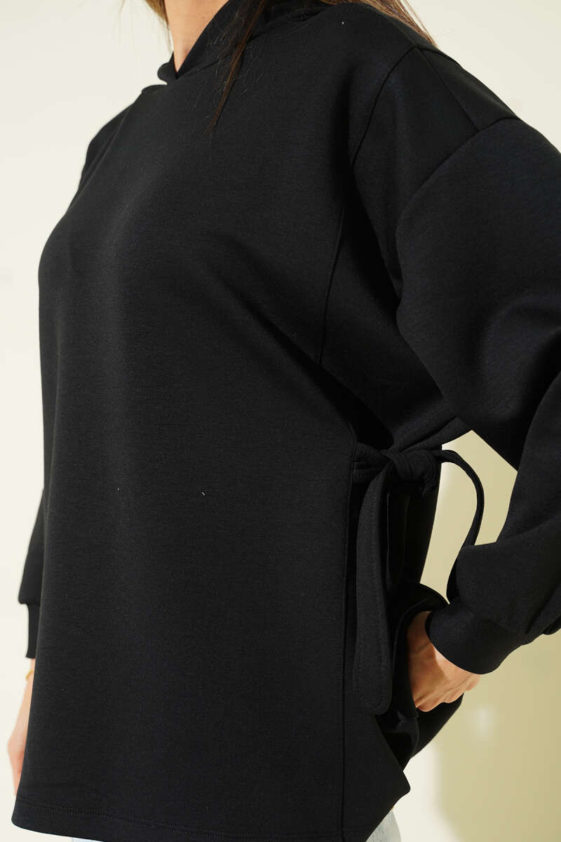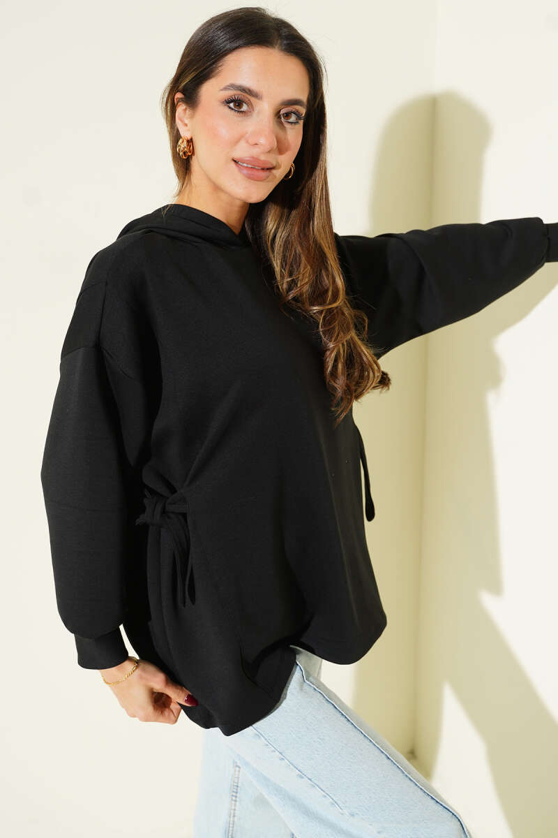 سويت شيرت أسود مزود بغطاء رأس ورباط جانبي