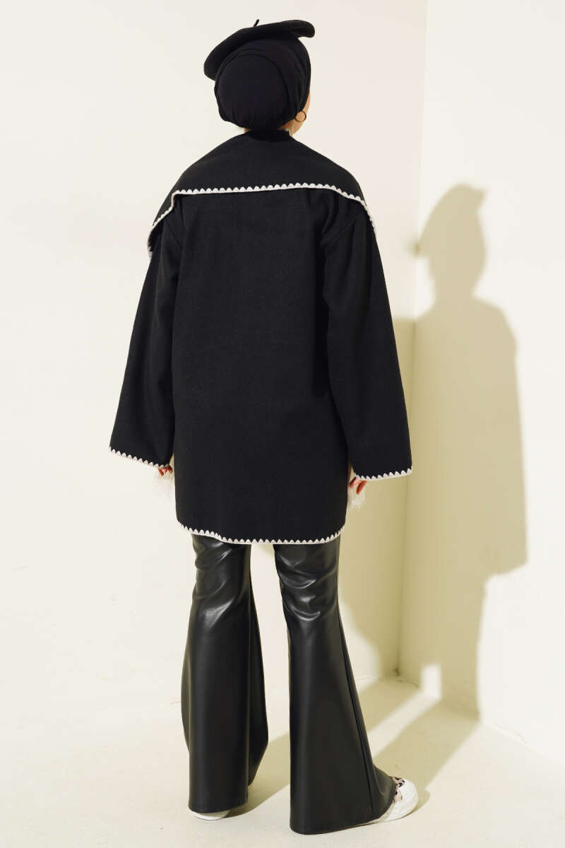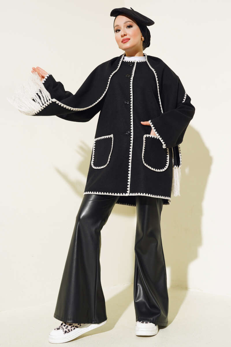 جاكيت أسود بتفاصيل خياطة مع وشاح
