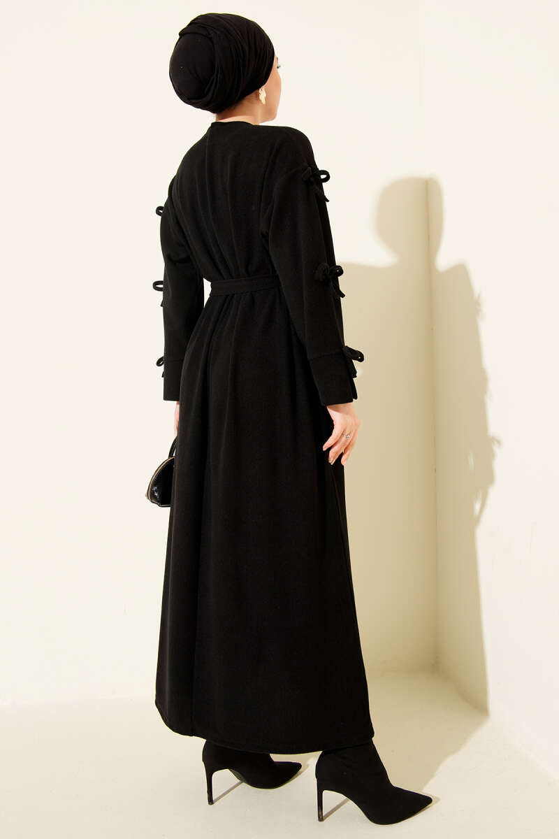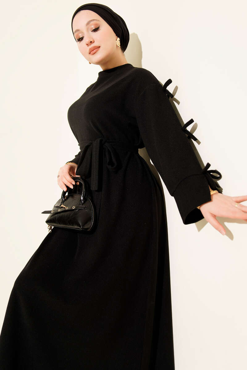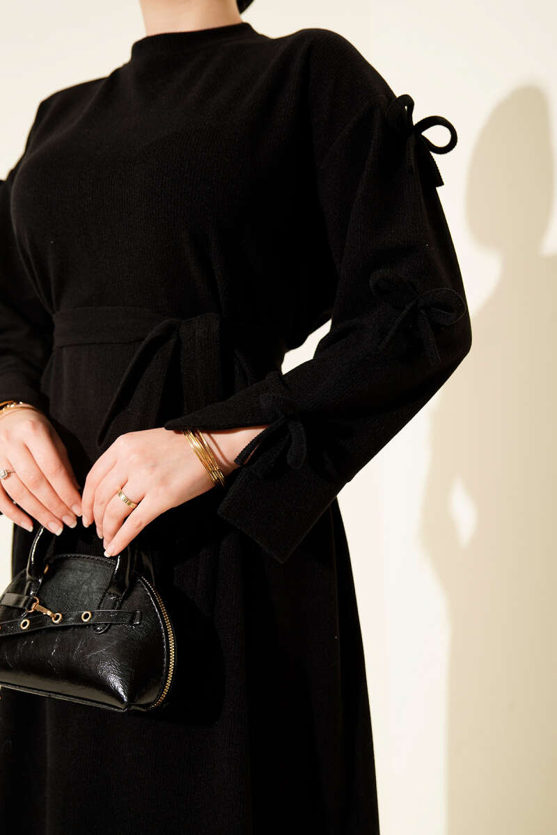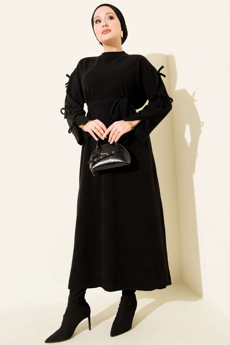 فستان توينيك أسود بأكمام مزينة بتفاصيل فيونكة