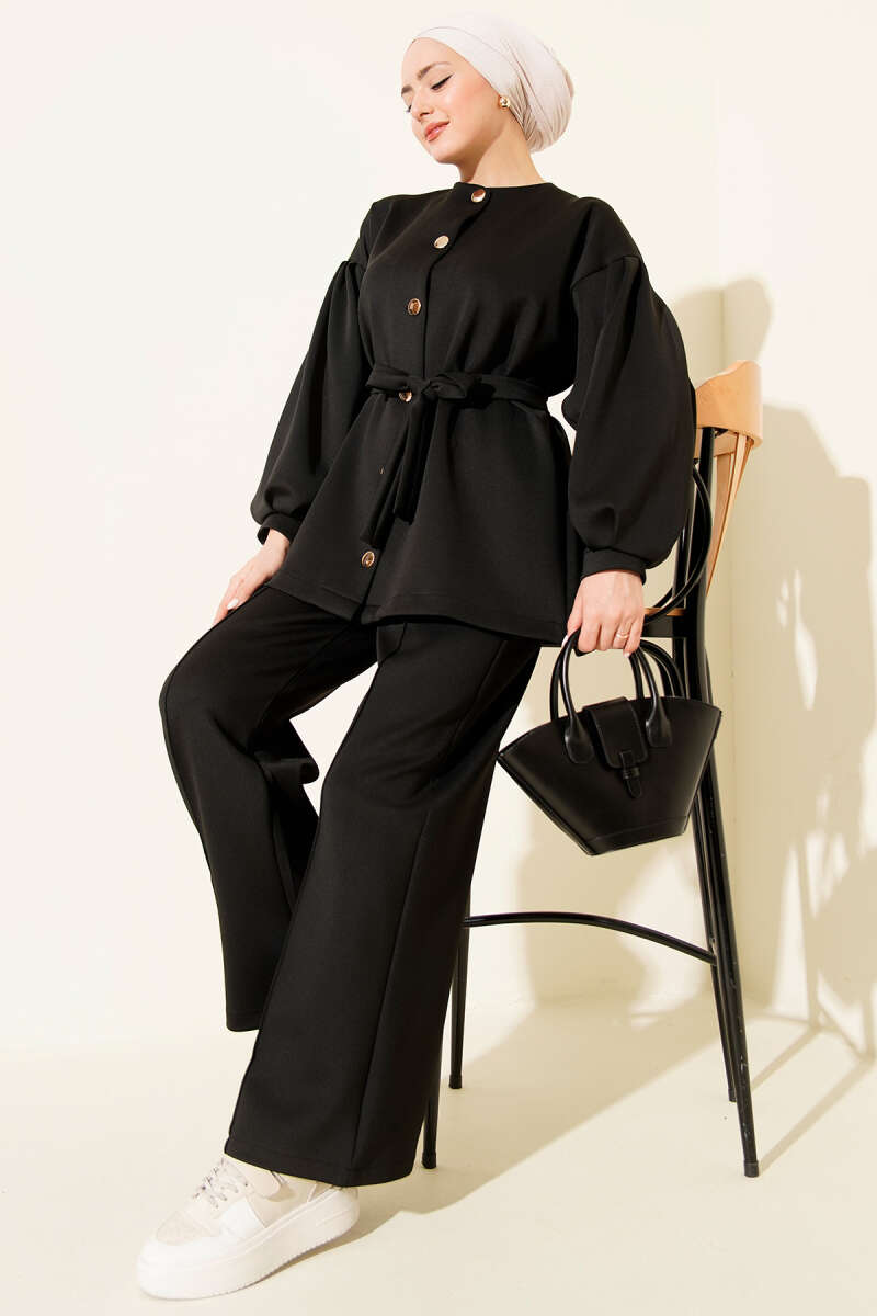طقم مكون من جزئين باللون الأسود مزود بأزرار معدنية وحزام