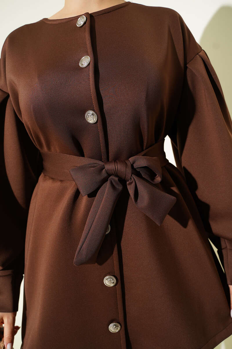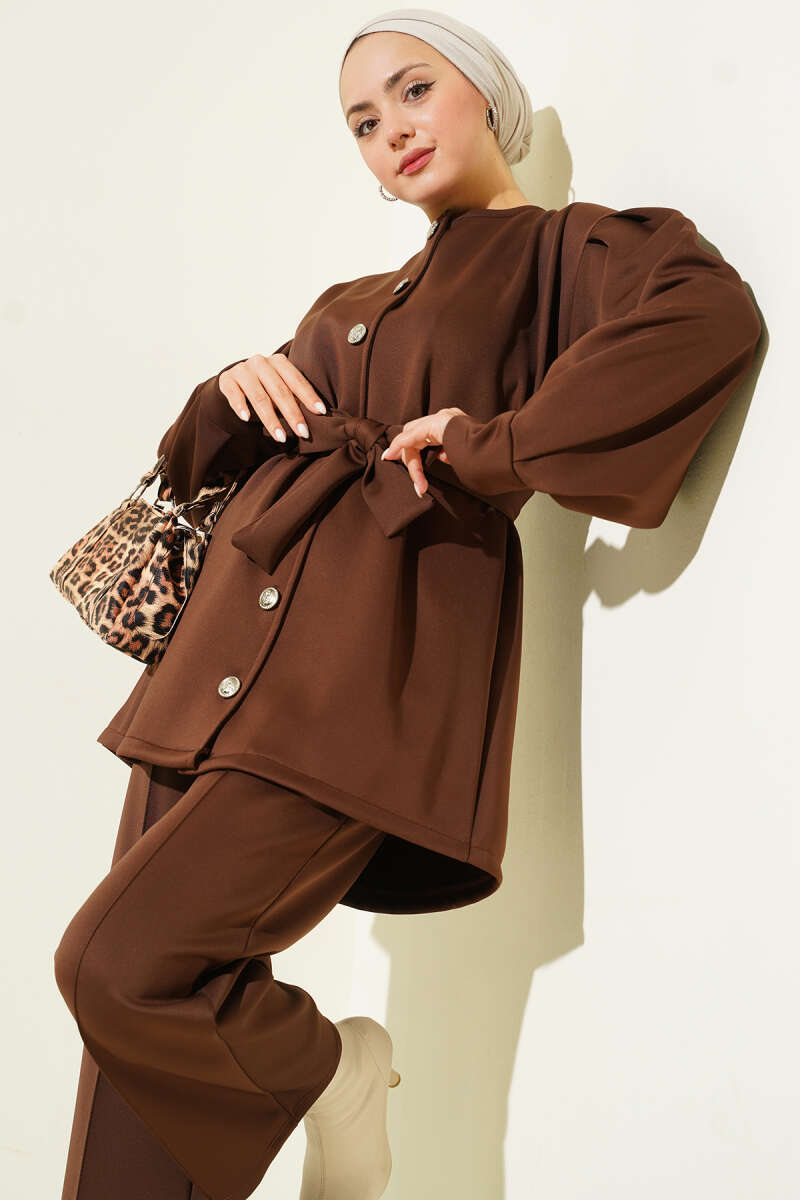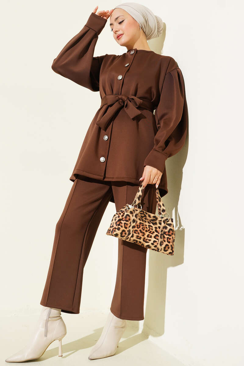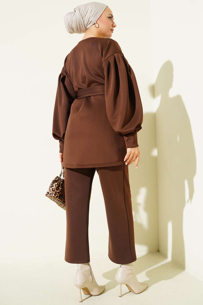 طقم سيكوبا ثنائي باللون البني مع أكمام منتفخة وحزام
