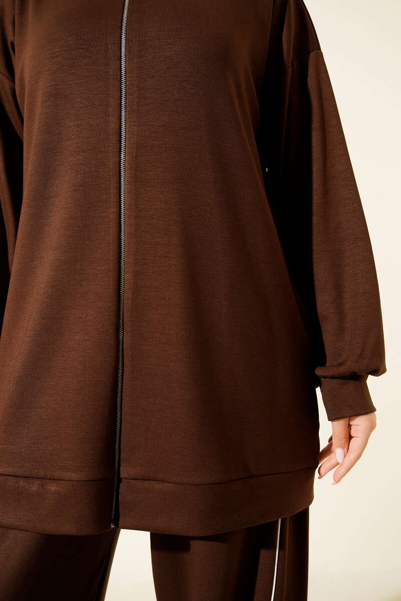 طقم ثنائي باللون البني مع سحاب وسروال مزين