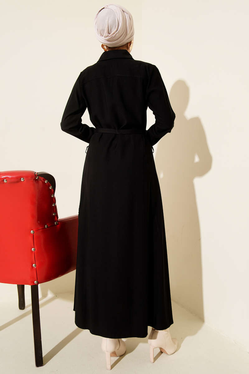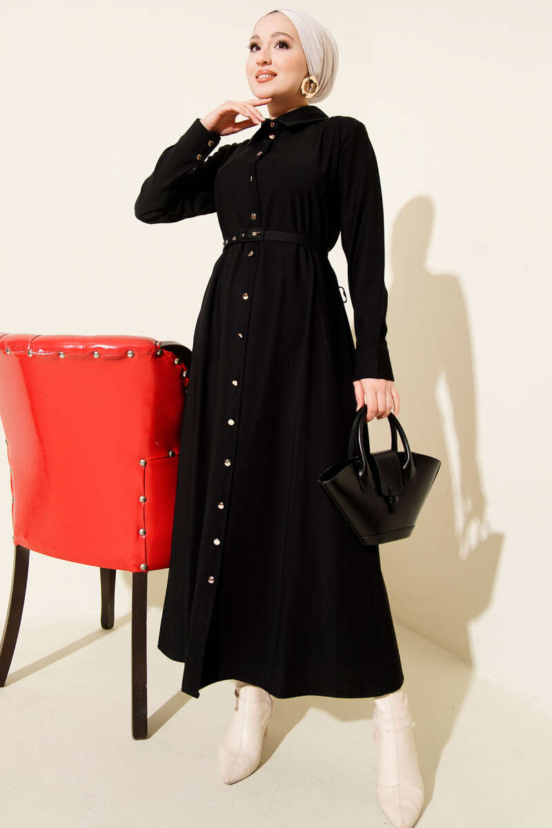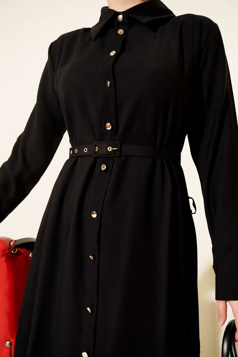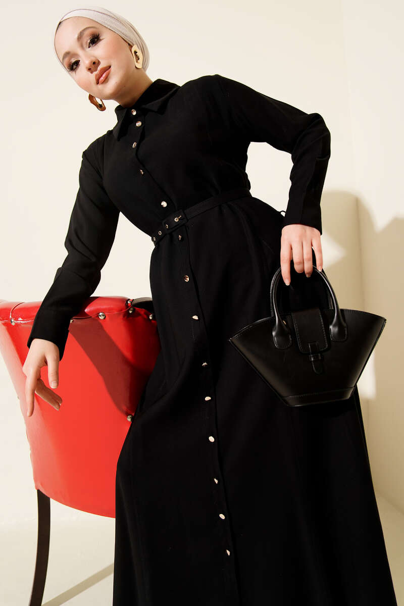 فستان أسود مزود بزر وحزام رفيع من تنسيل