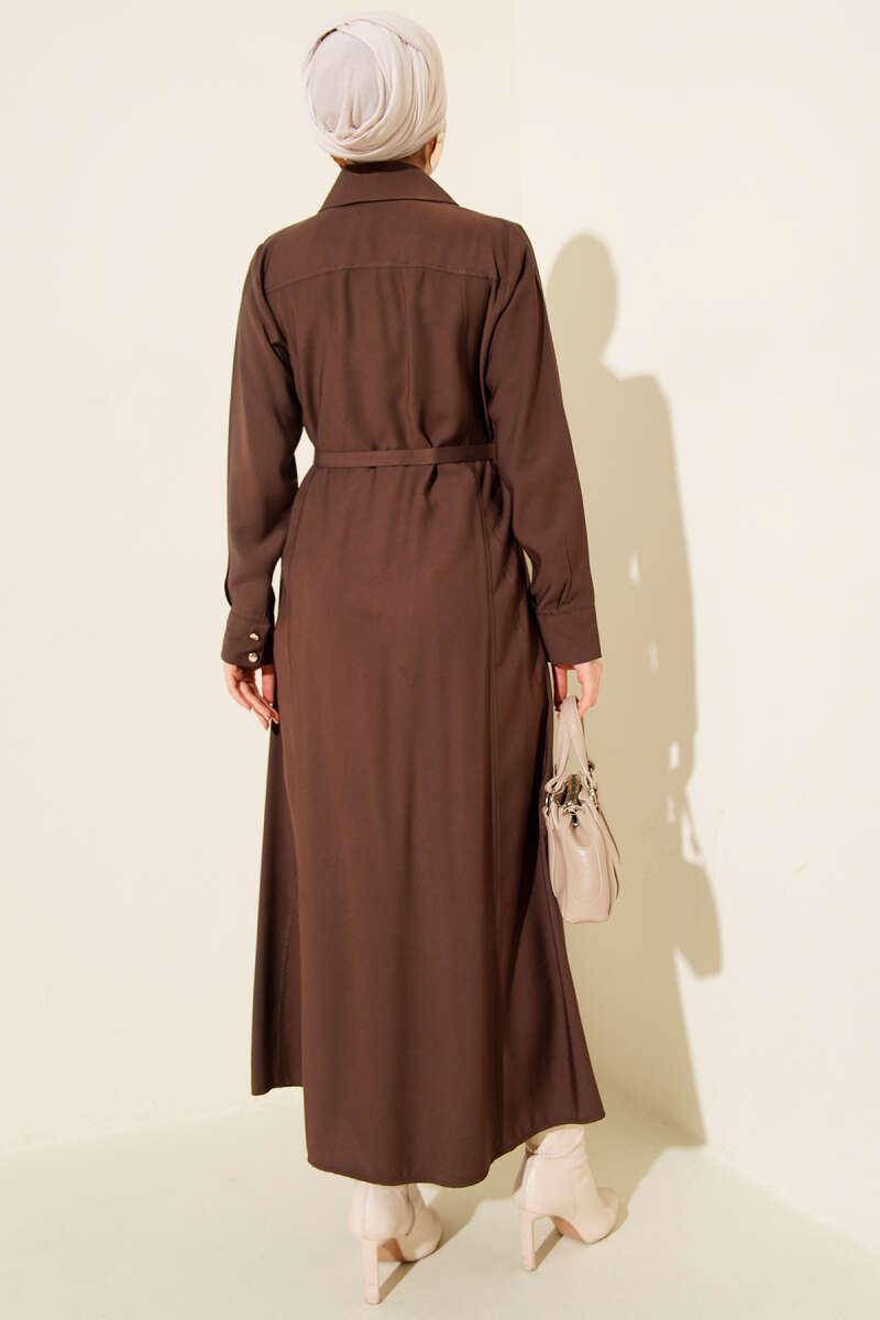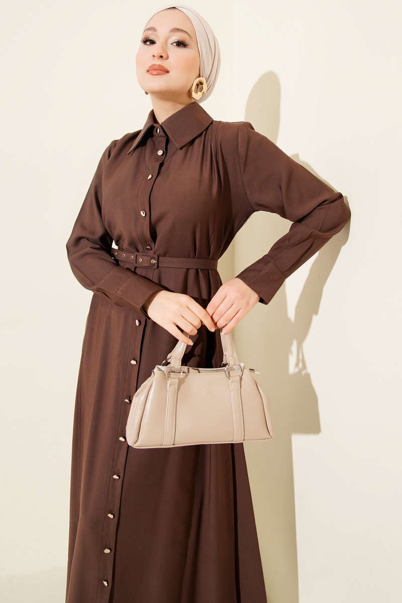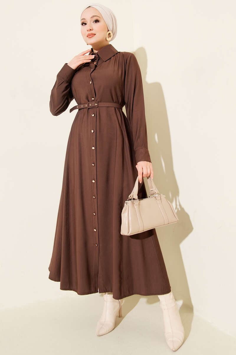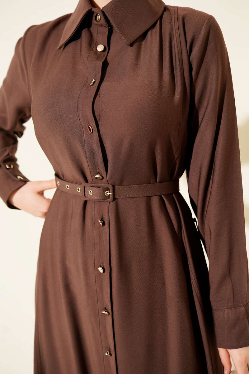فستان بني بتصميم قابل للتزرير مع حزام رفيع من تينسل