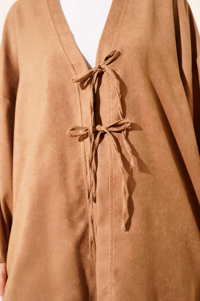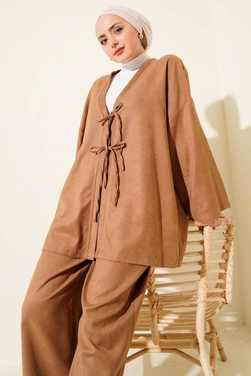 طقم مزدوج باللون الكاميل مع تفاصيل ربط من الأمام