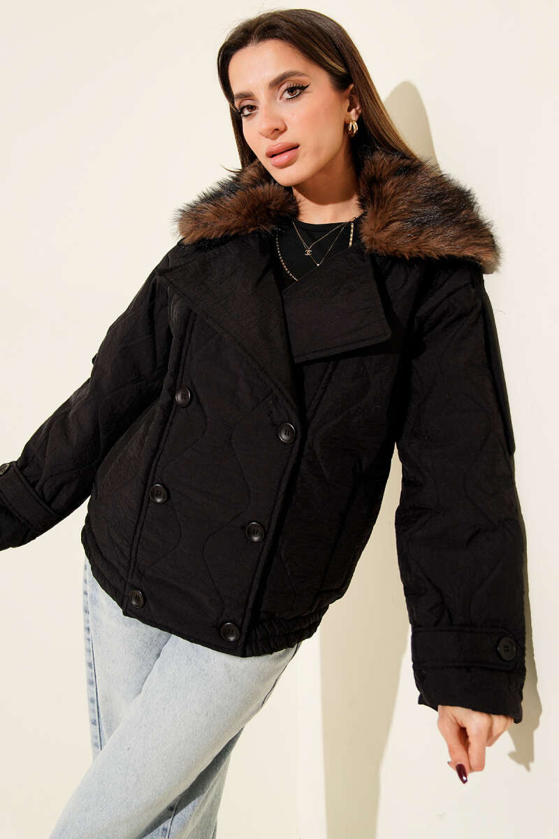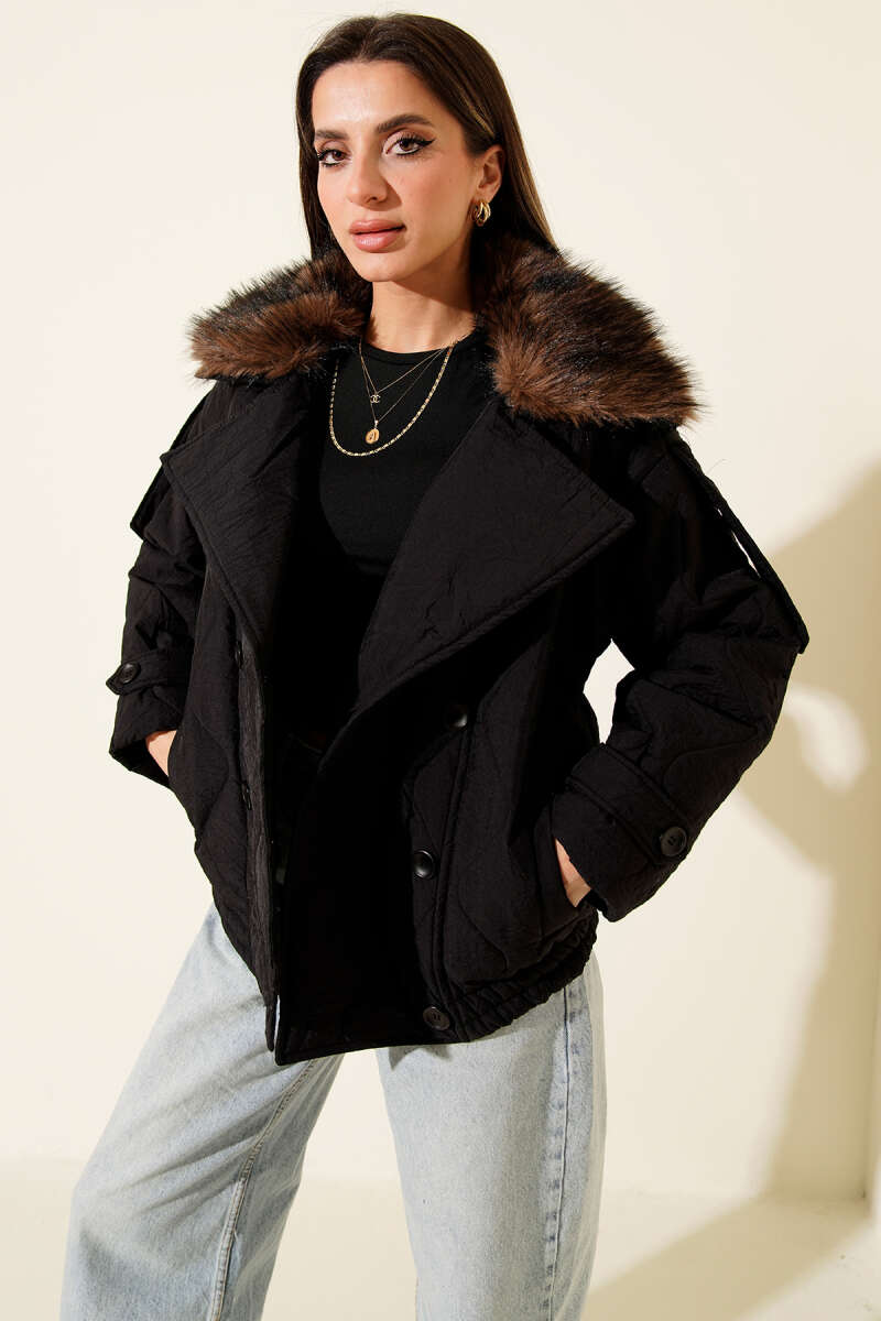 جاكيت مبطن بغطاء رأس وفراء صناعي أسود