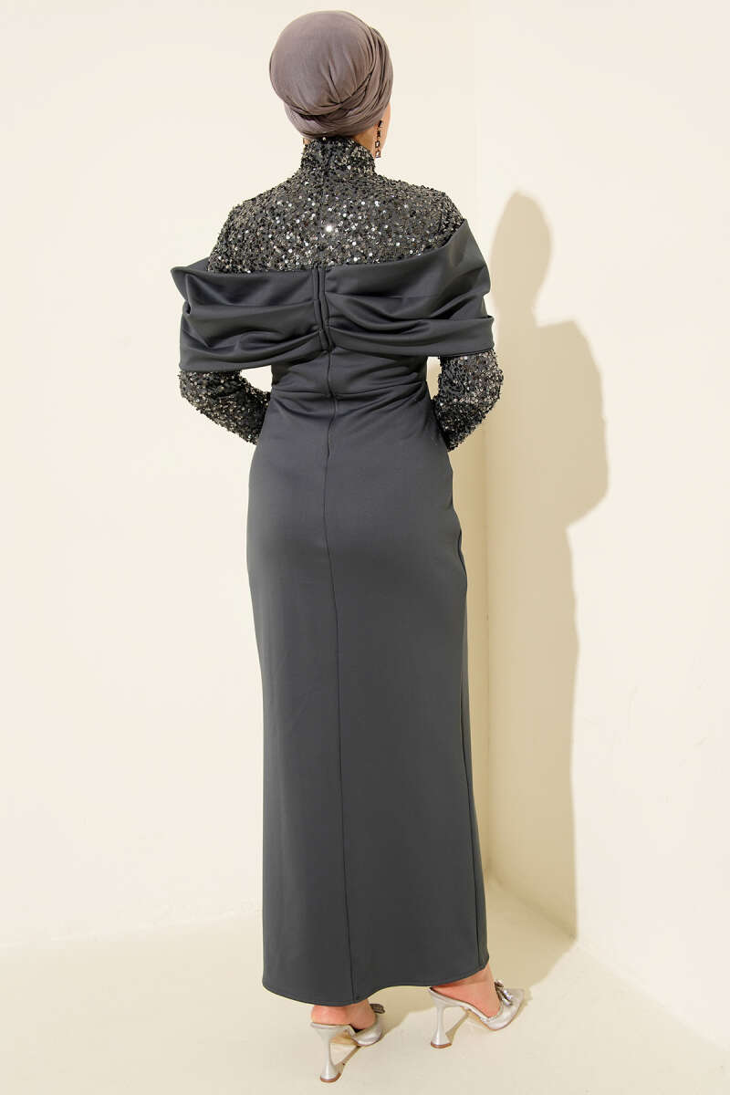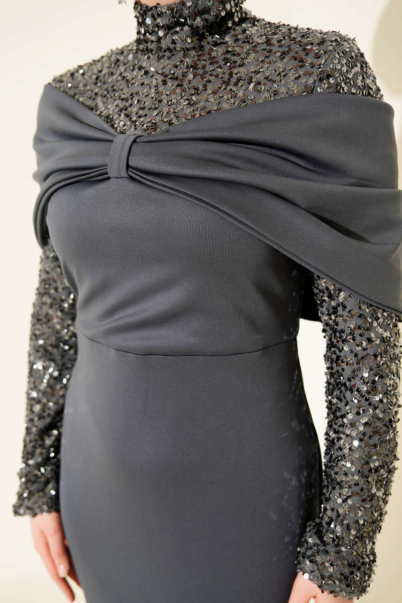 فستان سهرة بأزرار من الأمام مع ترتر باللون الرمادي الداكن