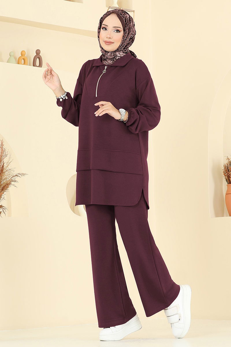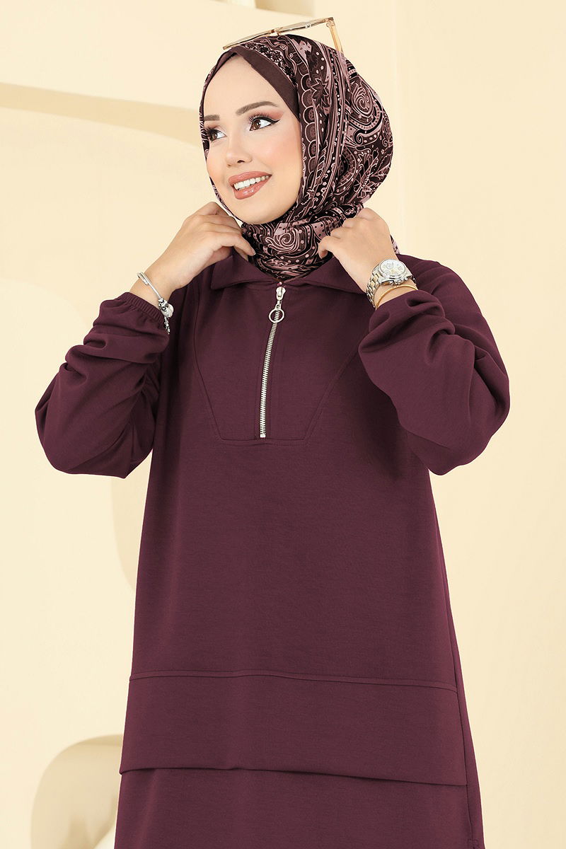 طقم من قماش مودال بسحاب نصفي بلون بورغندي غامق