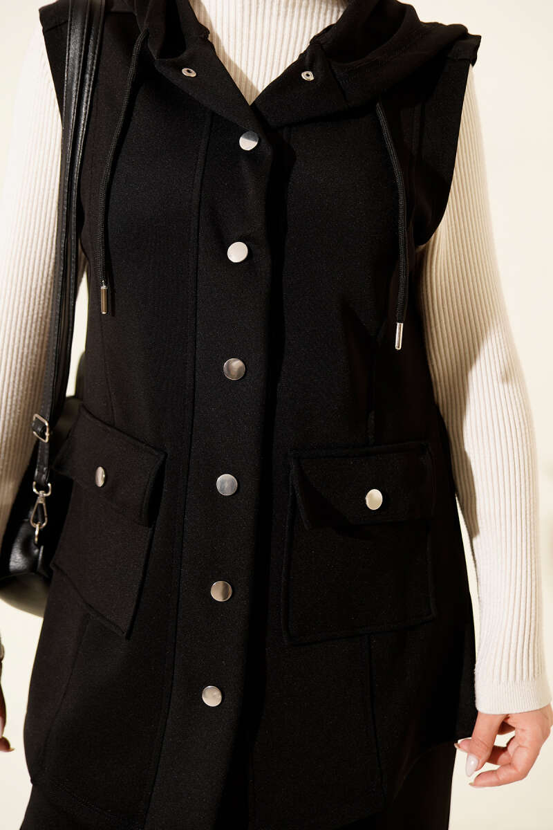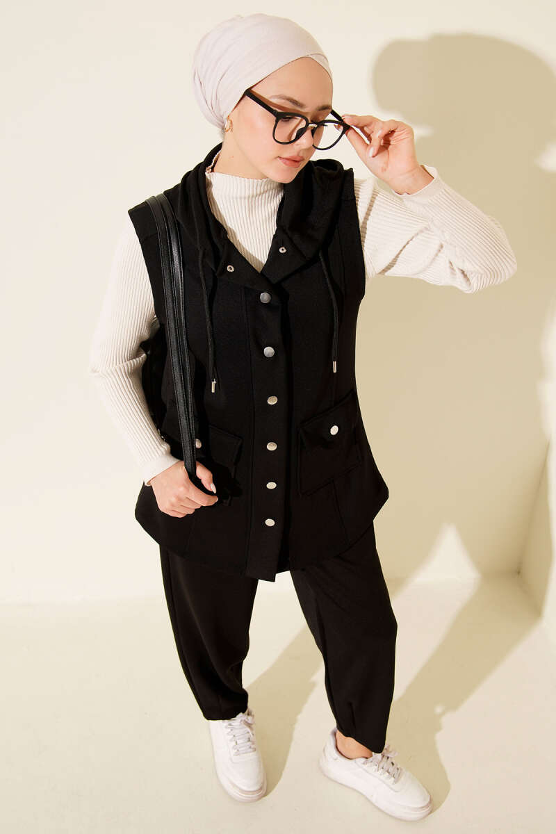 طقم سترة سكوبا مزودة بغطاء للرأس وأزرار ضغط - أسود