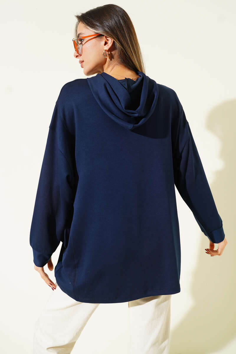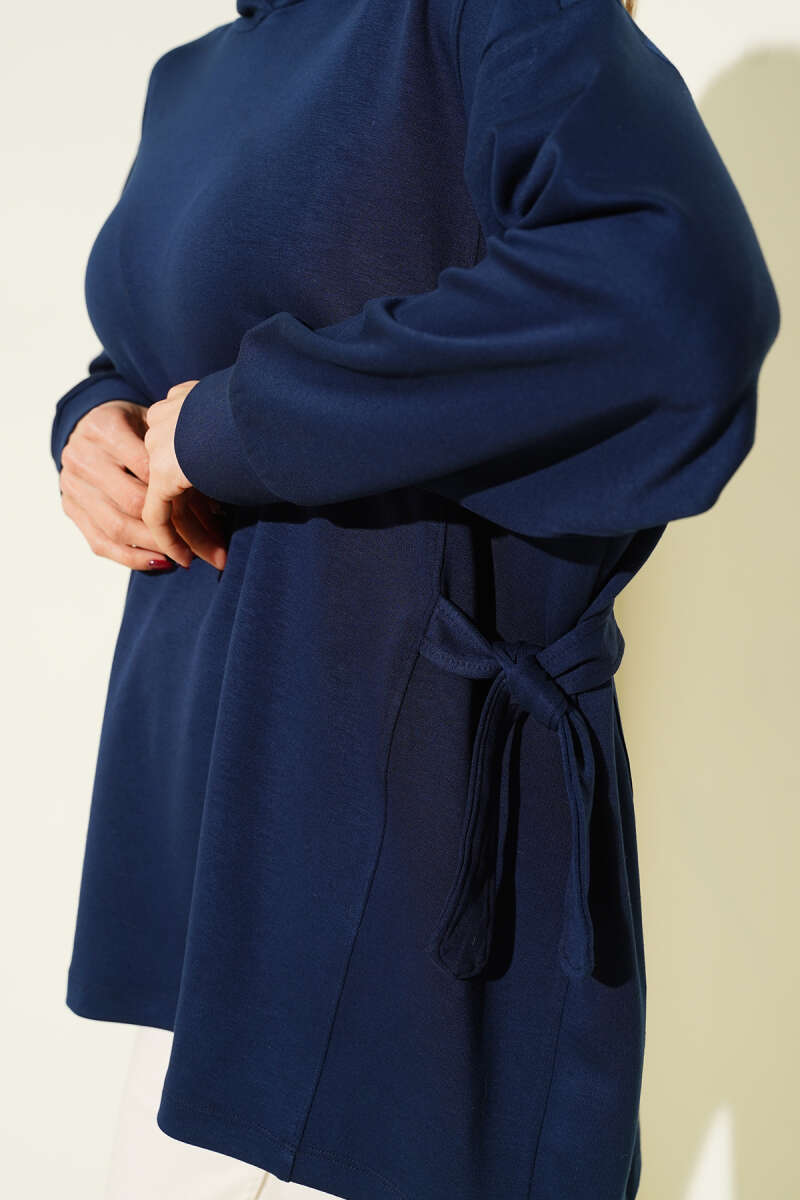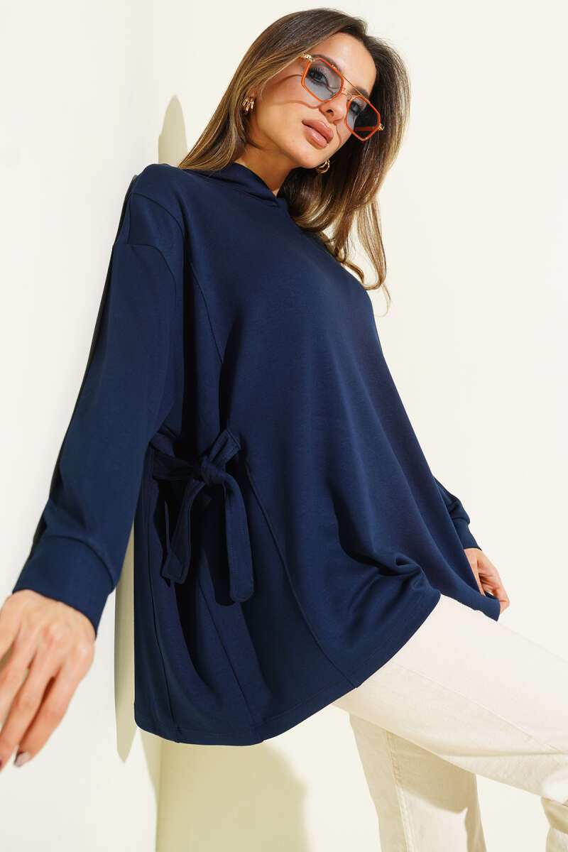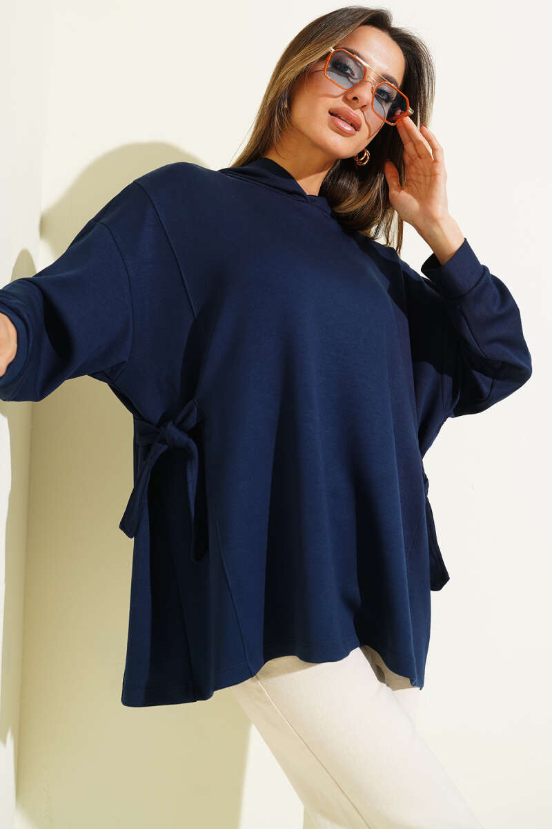 سويت شيرت بقلنسوة ورباط جانبي باللون الأزرق الداكن
