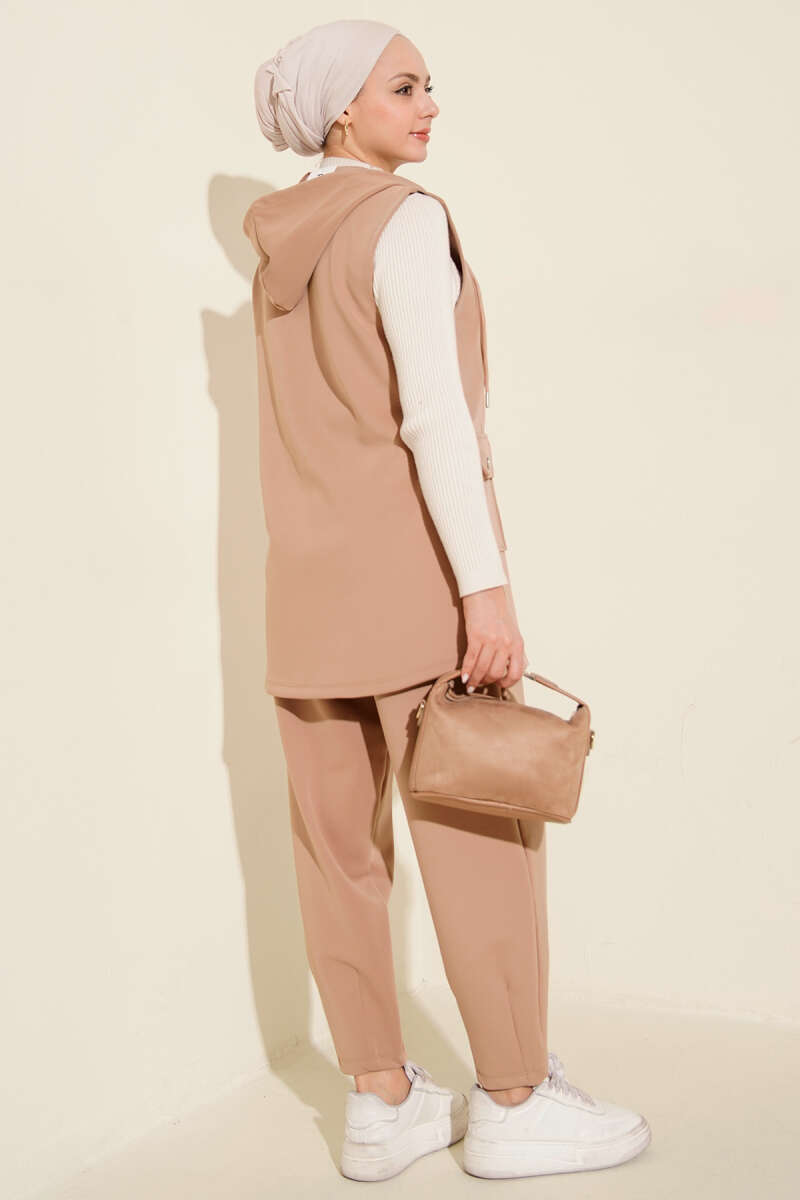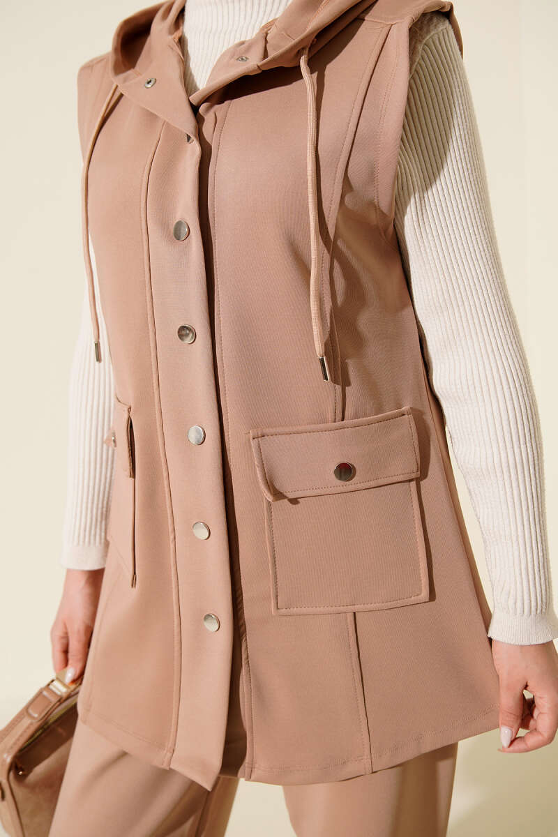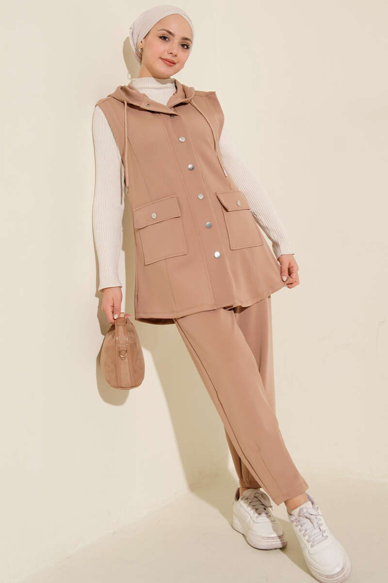 طقم سترة سكوبي بغطاء رأس مع أزرار بلون اللاتيه