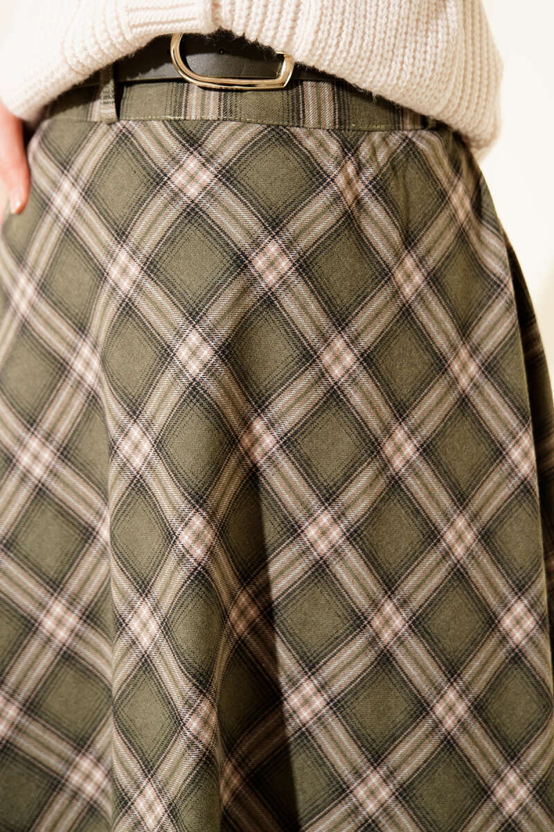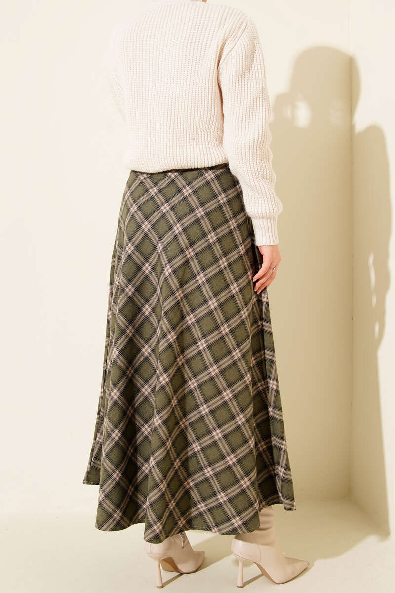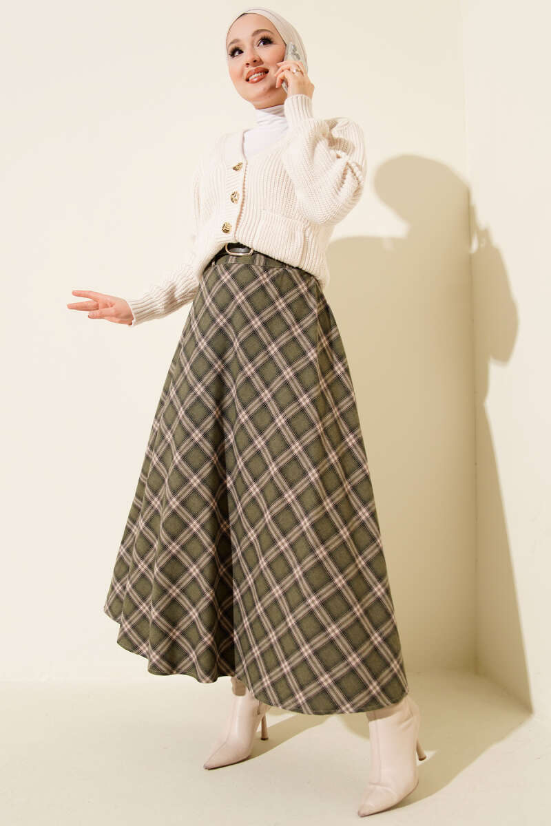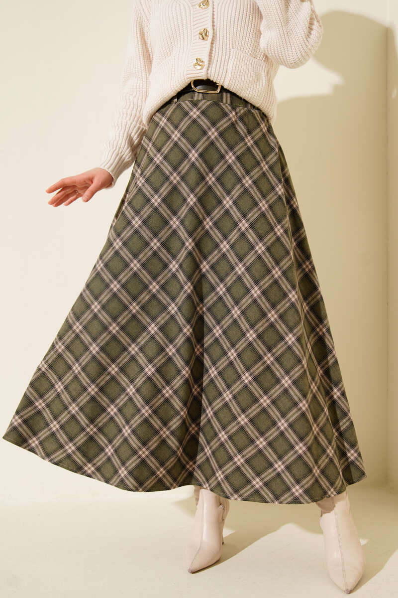 تنورة بنقشة كاريه مع حزام - أخضر زيتوني