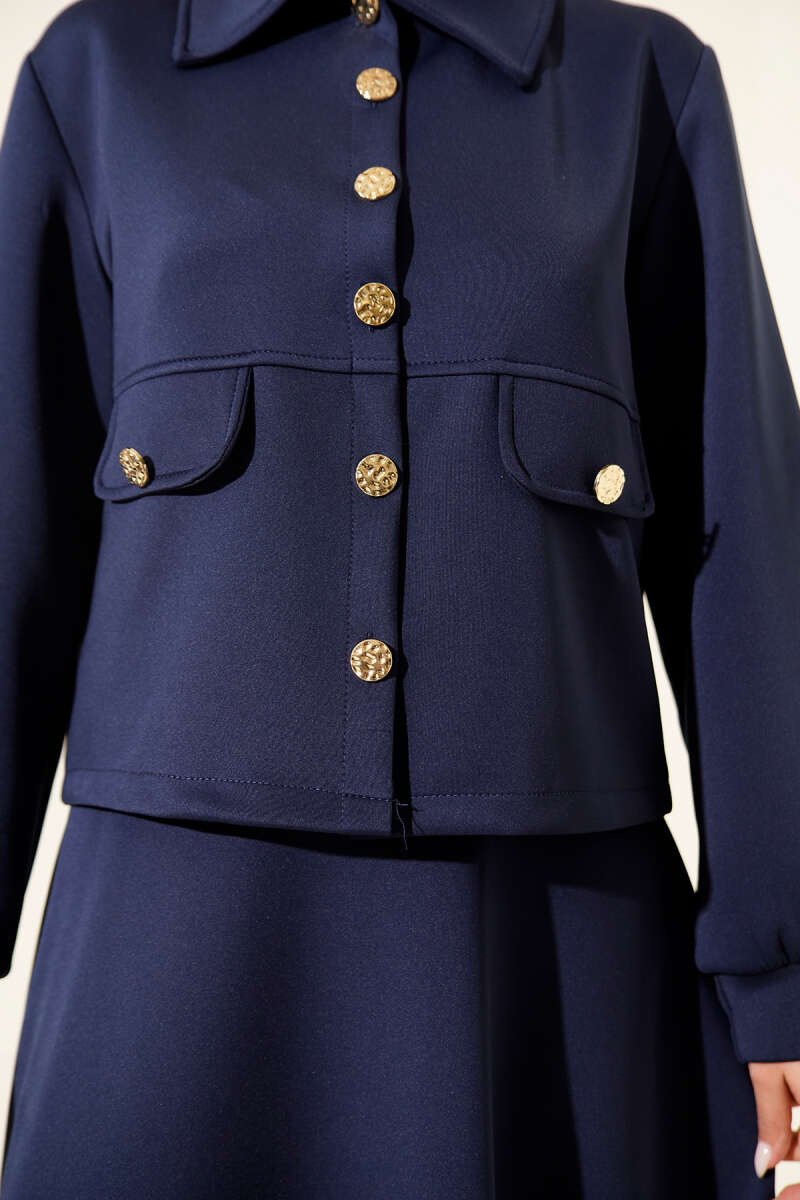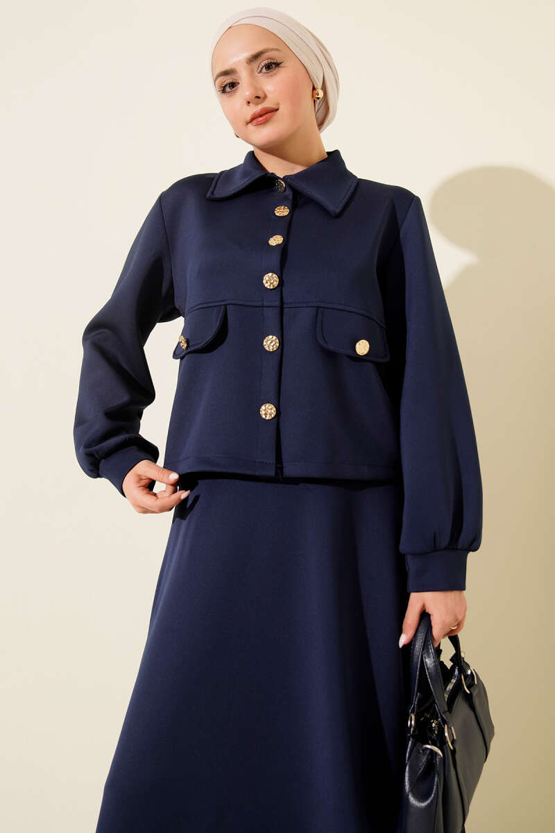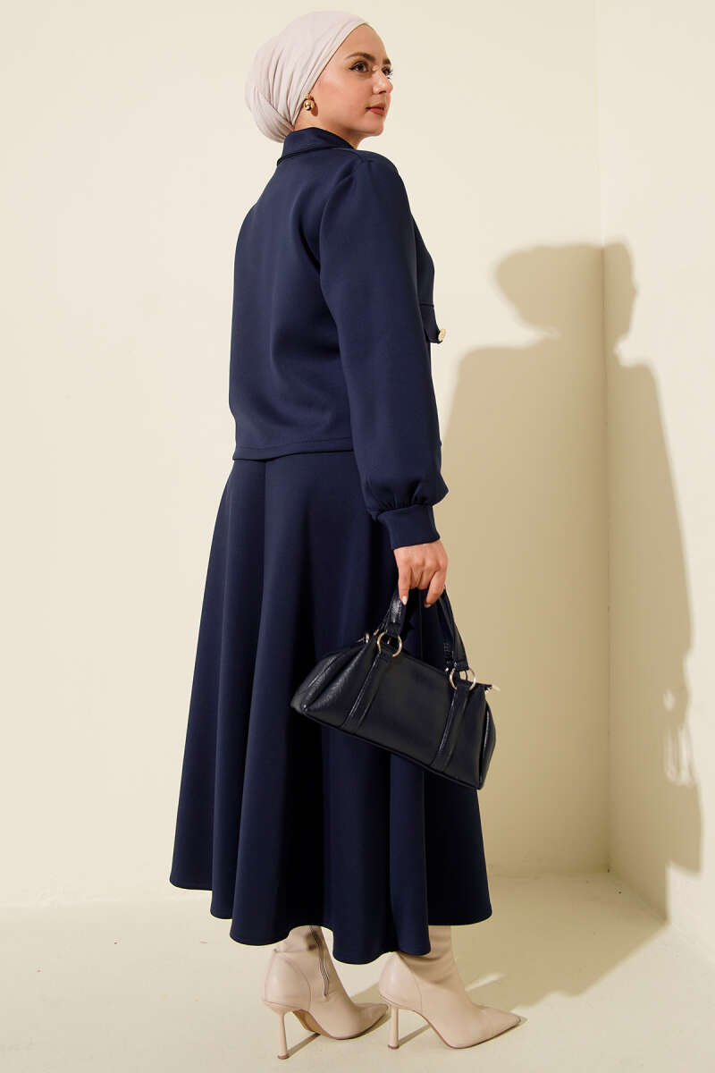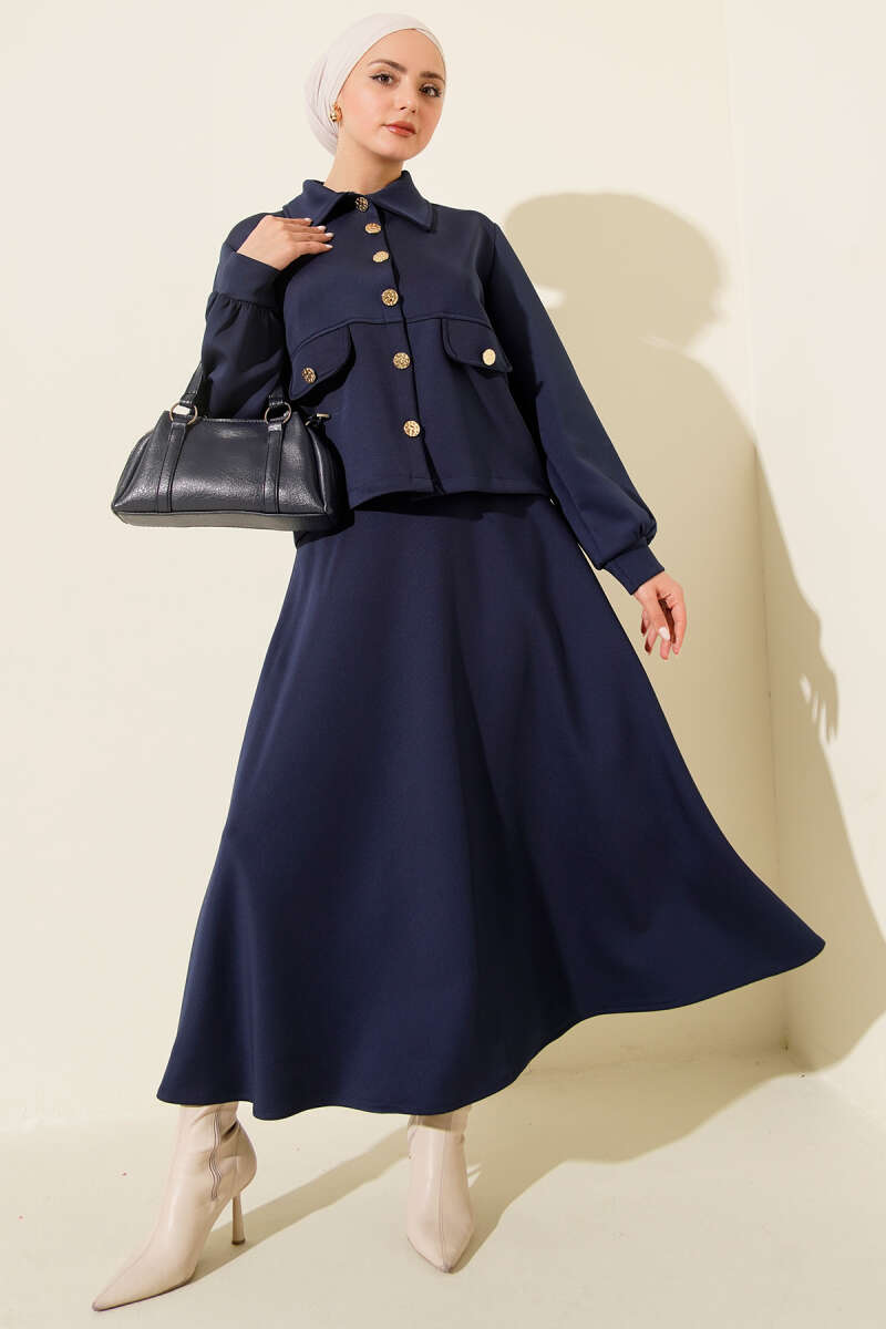 طقم تنورة سكوبر الزرقاء مع جيوب وهمية وزر