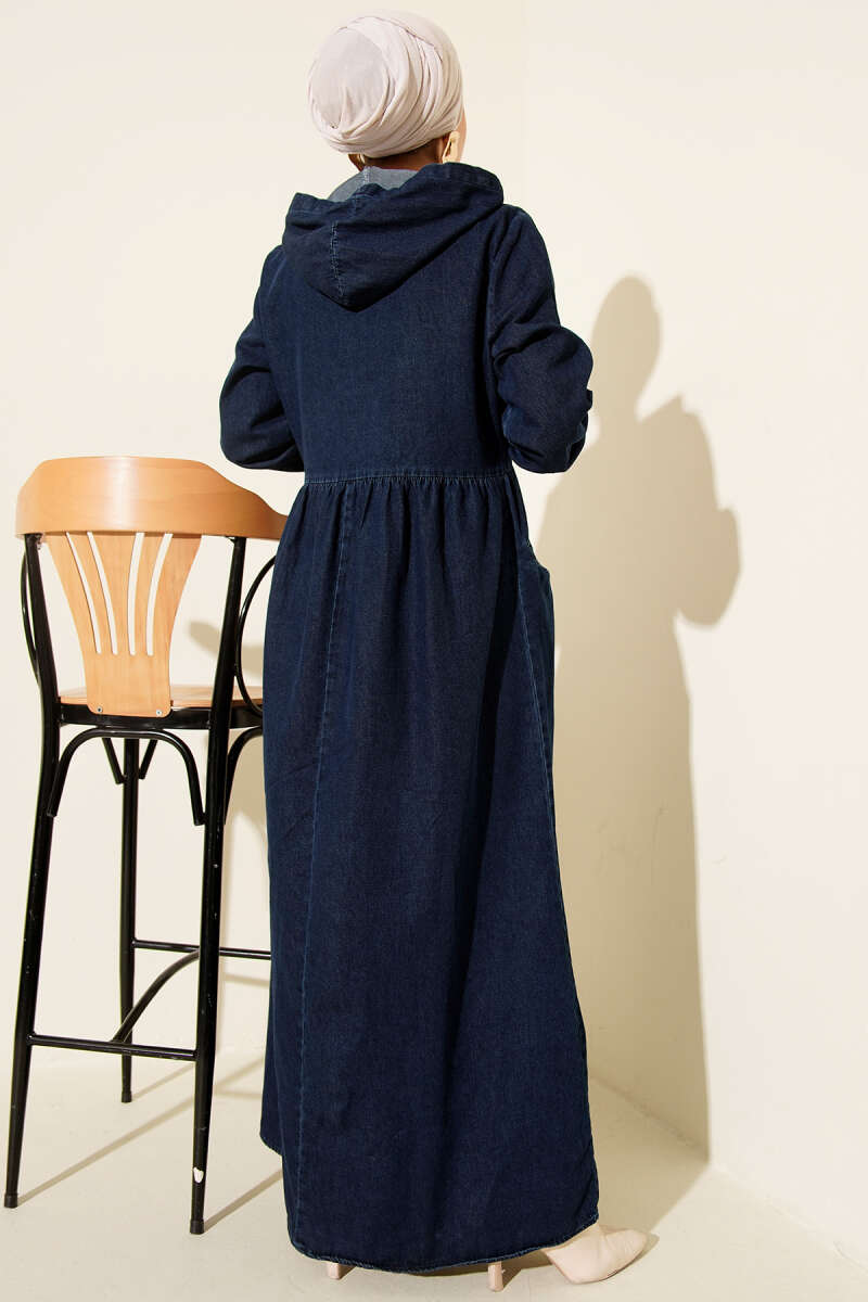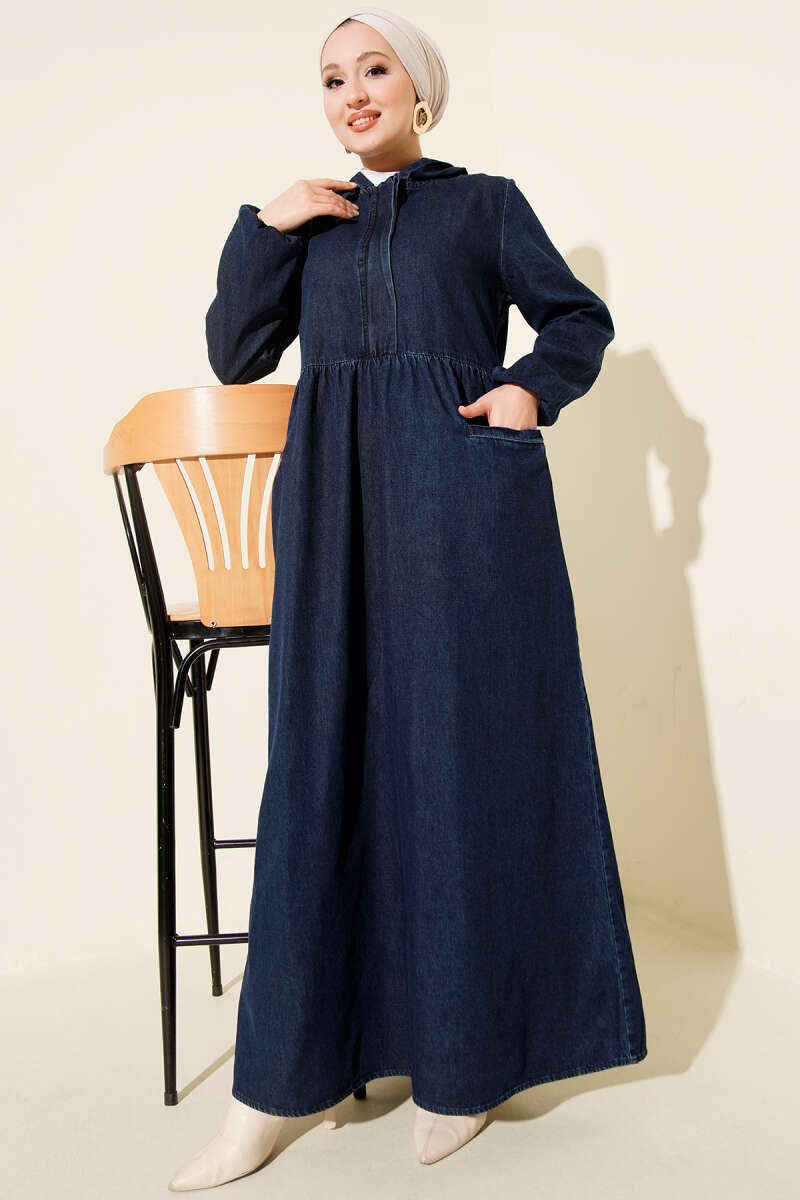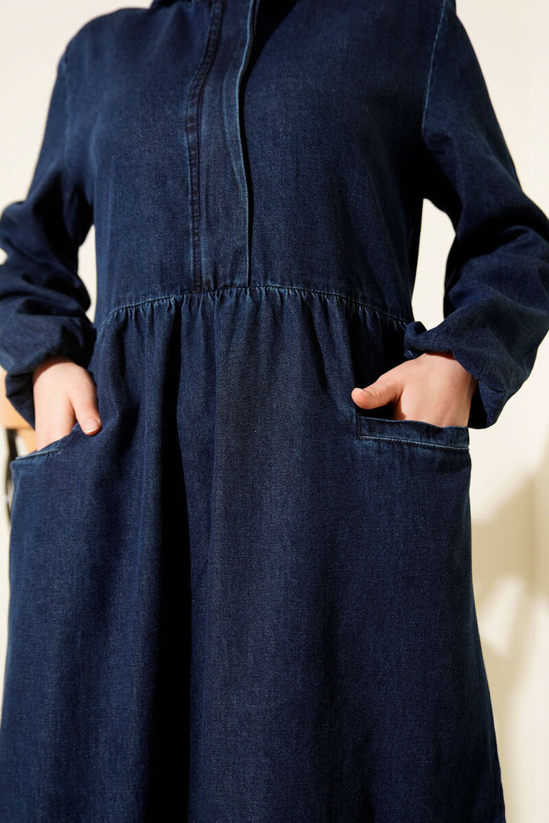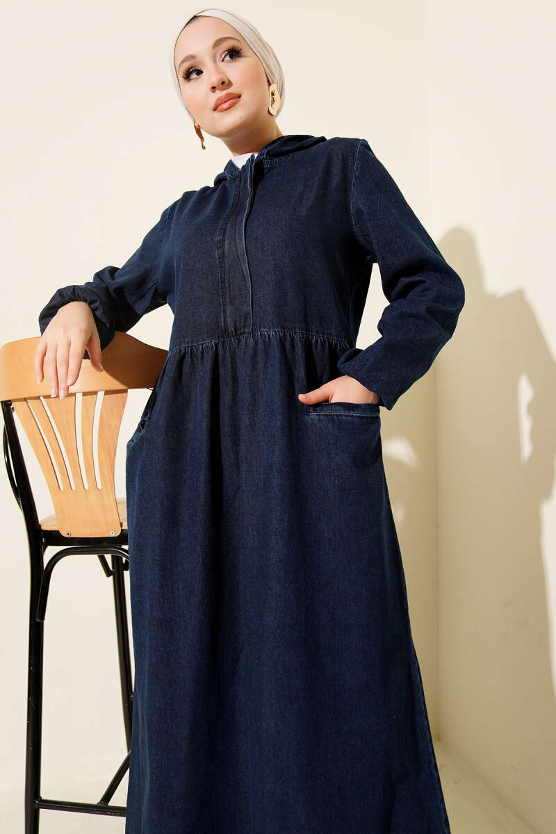 فستان جينز نصف سحاب مع غطاء رأس باللون الأزرق الداكن