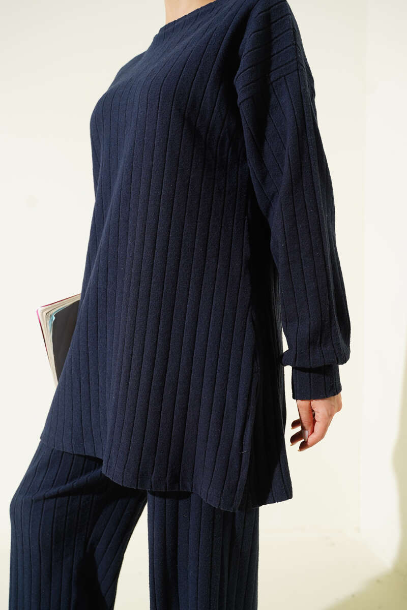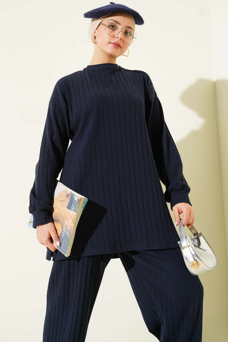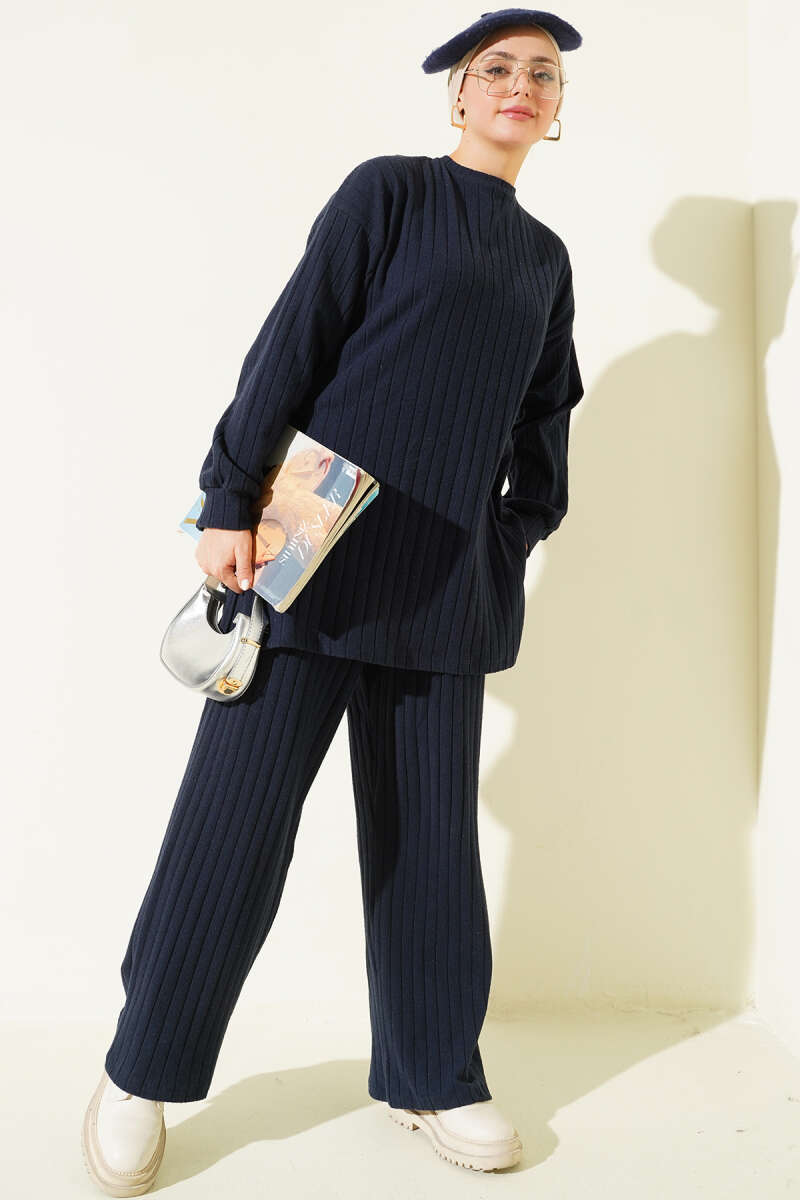 بدلة أيروبين من قطعتين مع كتاف وكارديجان طويل باللون النيلي