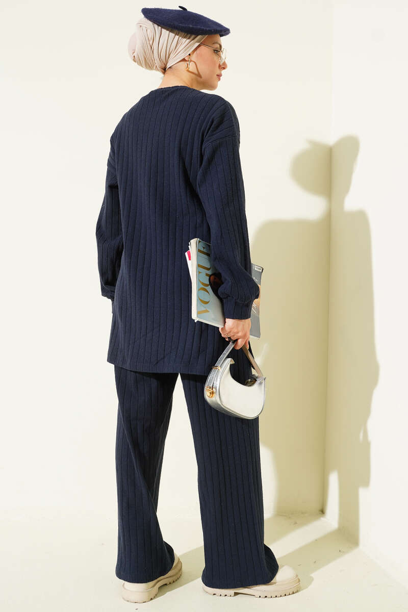 طقم مزدوج بتصميم ضيق بياقة دائرية باللون الأزرق الداكن