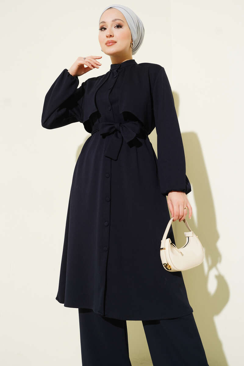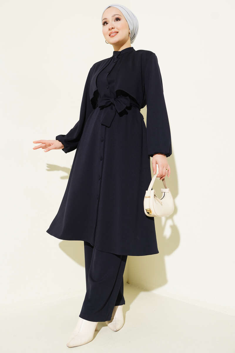 طقم مزدوج بلون الأزرق الداكن مع طوق كيب