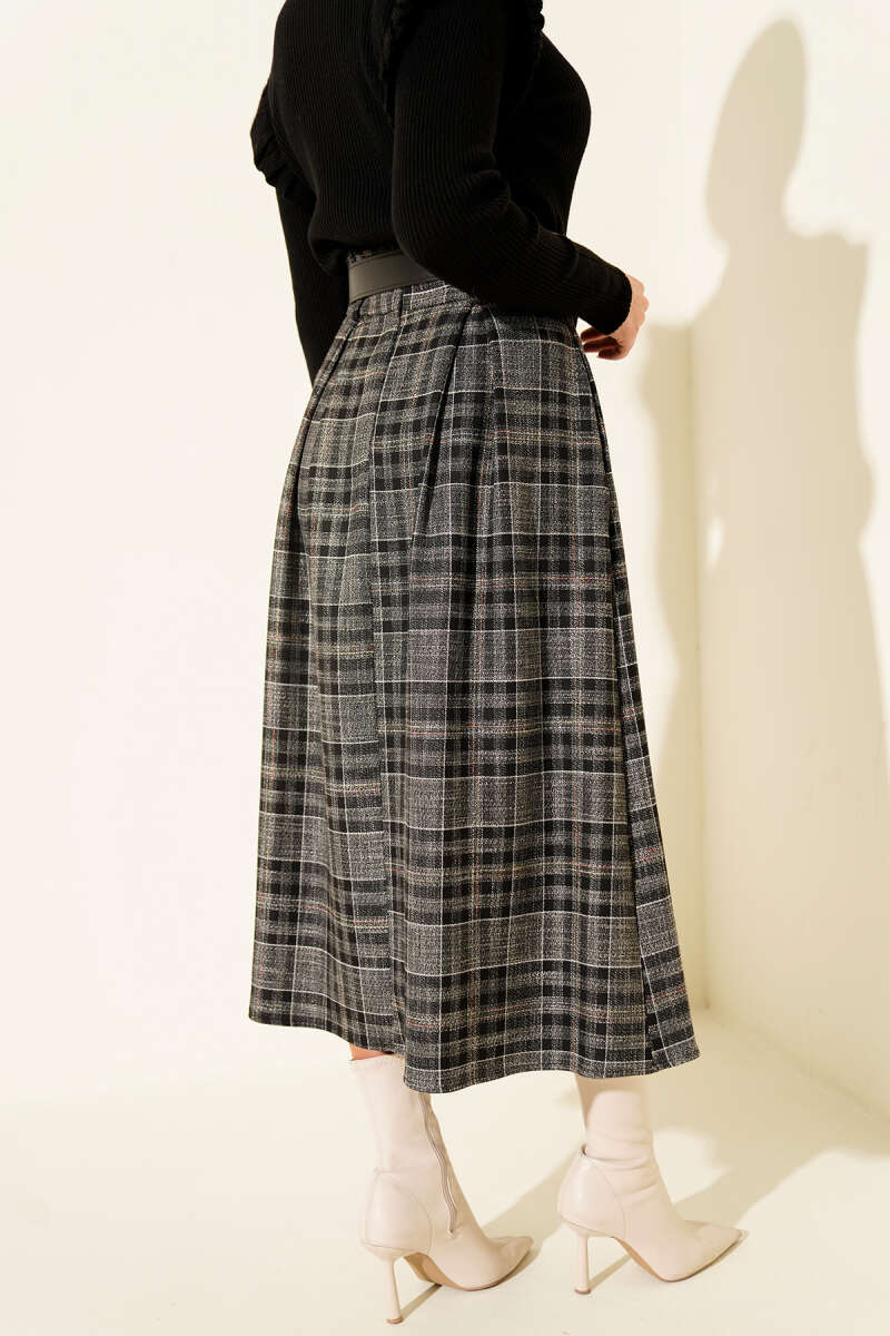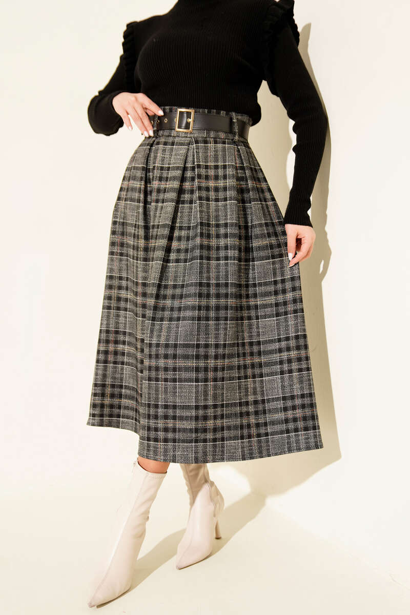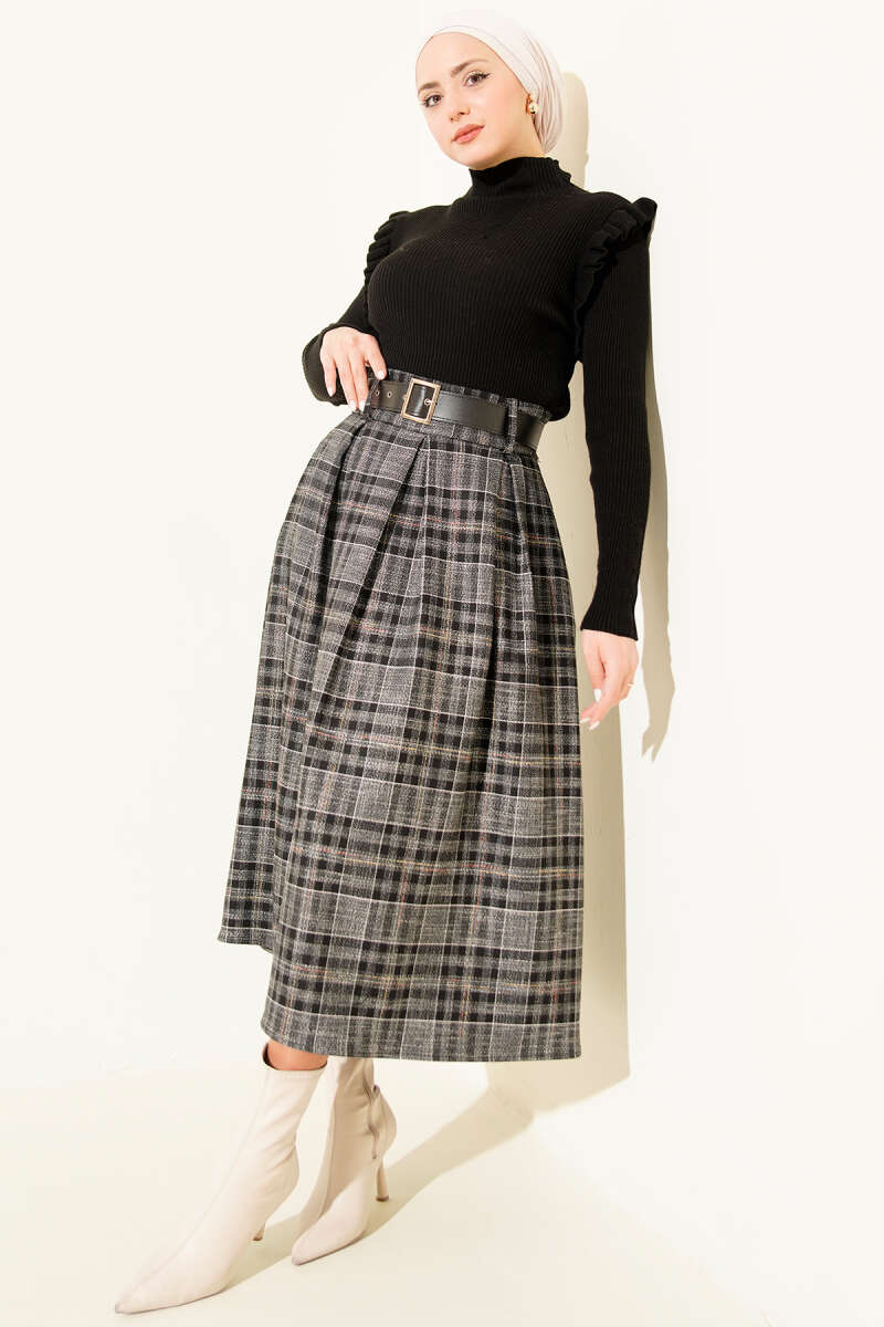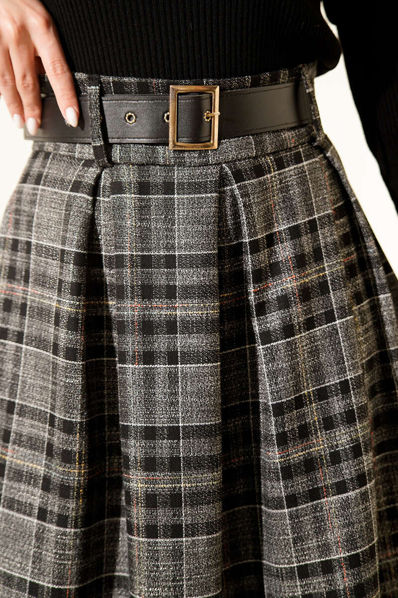 تنّورة سوداء مزينة بنقشة كارو ومزودة بحزام
