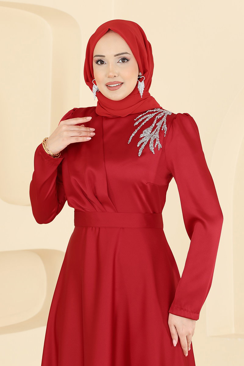 فستان أحمر من الساتان مزين بكتفين