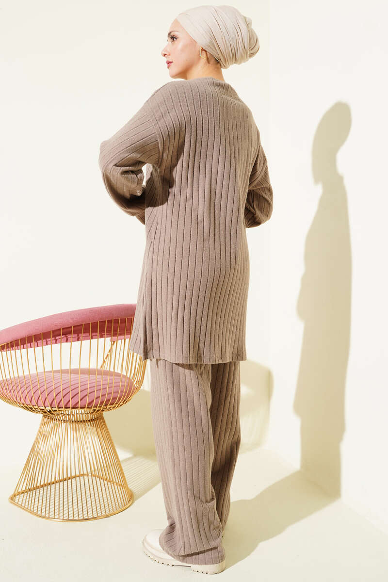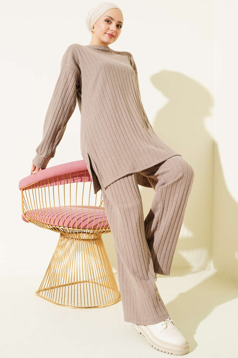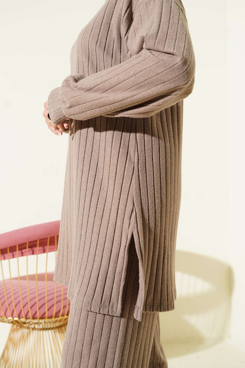 مجموعة من قطعتين مع ياقة دراجة من التريكو المضلع بلون اللاتيه