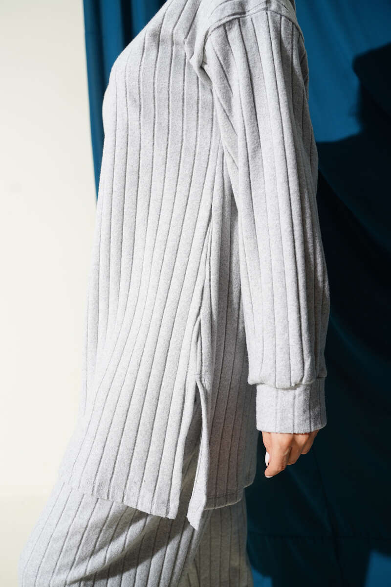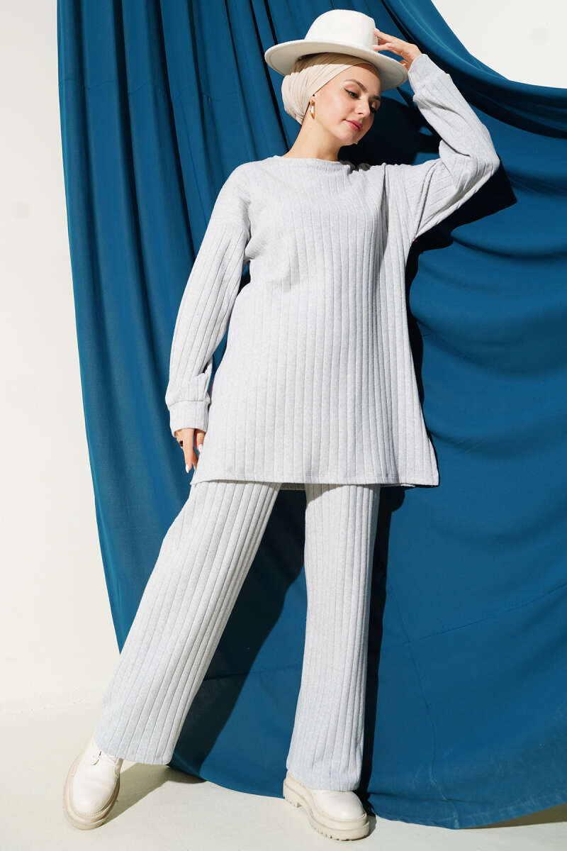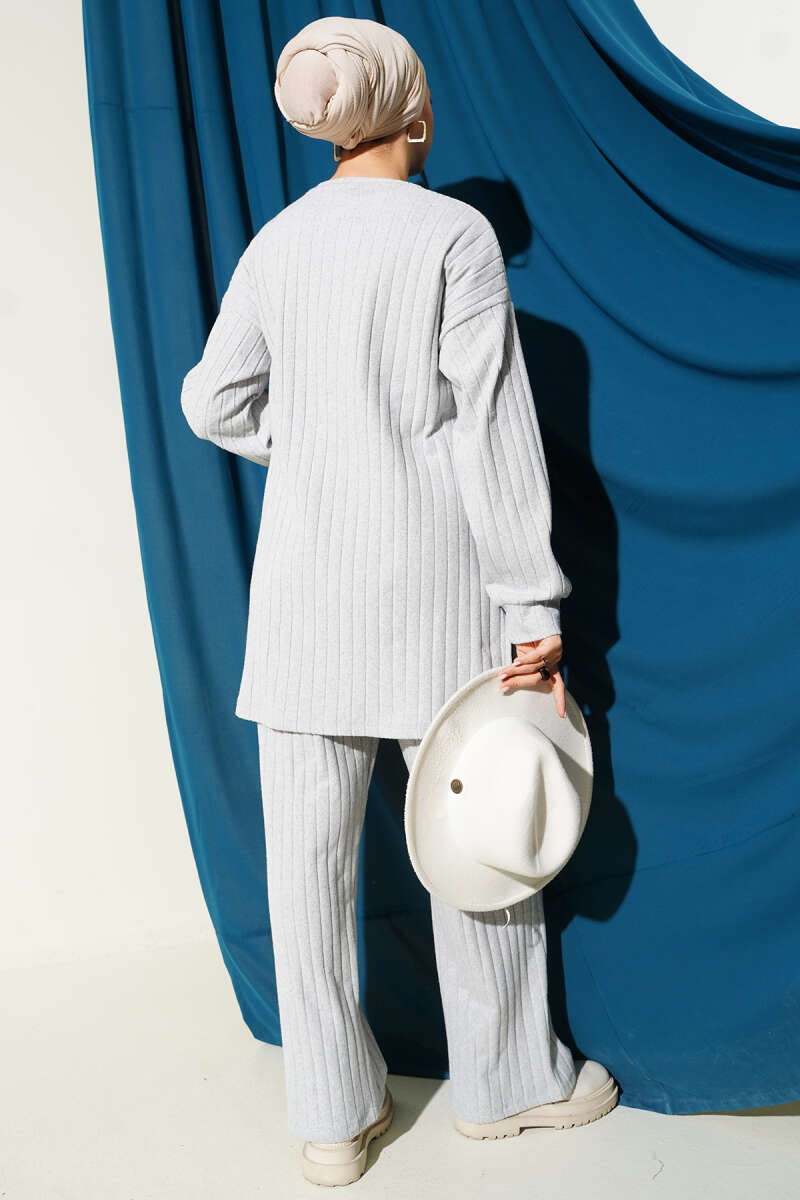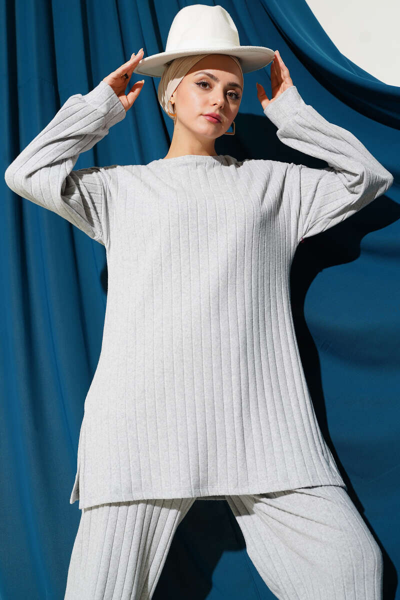 طقم مكون من قطعتين مع ياقة على شكل دراجة بتفاصيل مضلعة - رمادي
