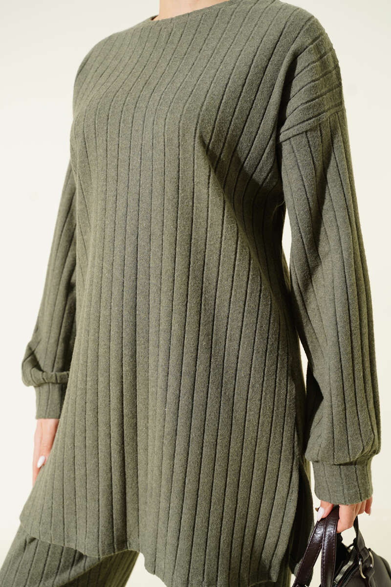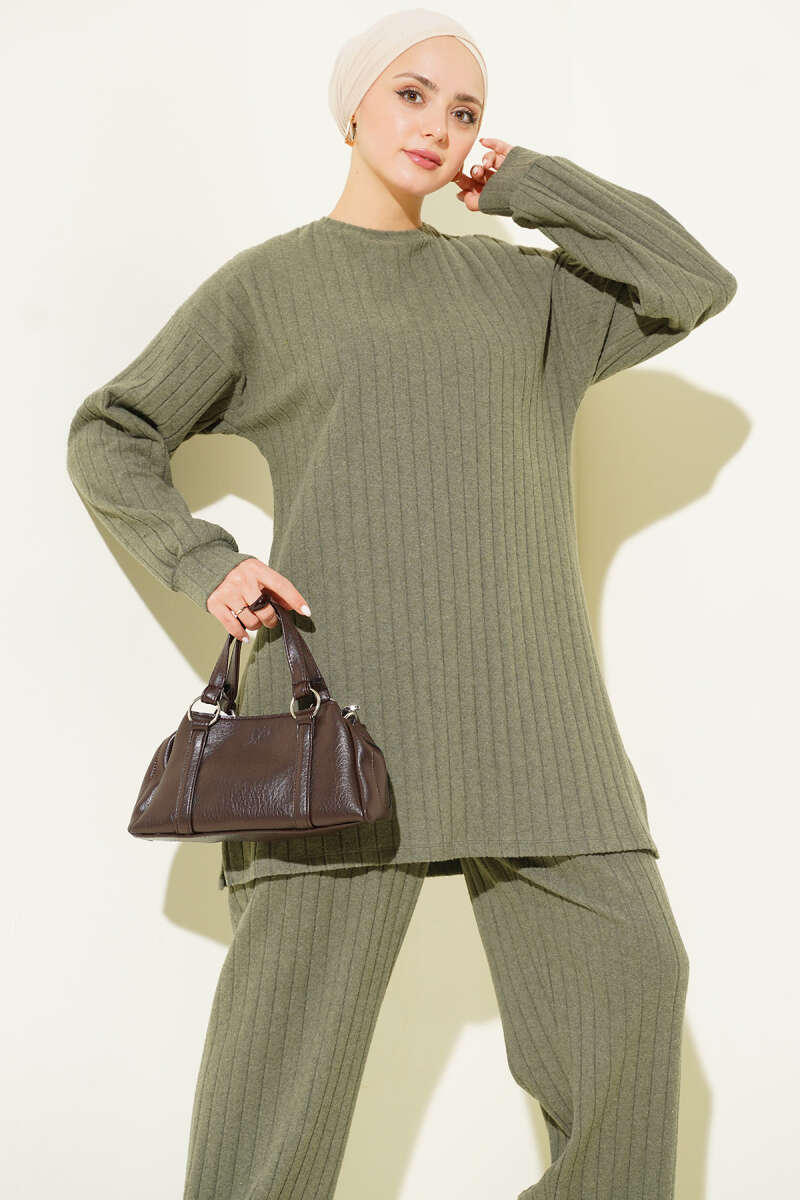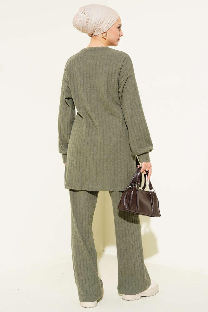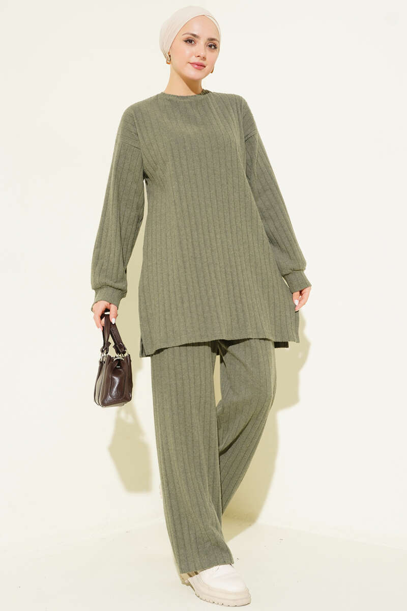 طقم مكون من قطعتين من النسيج المحبوك بتصميم ياقة الدراجة بلون الكاكي