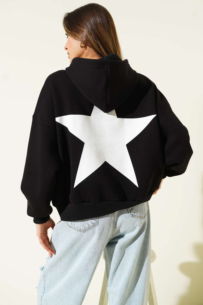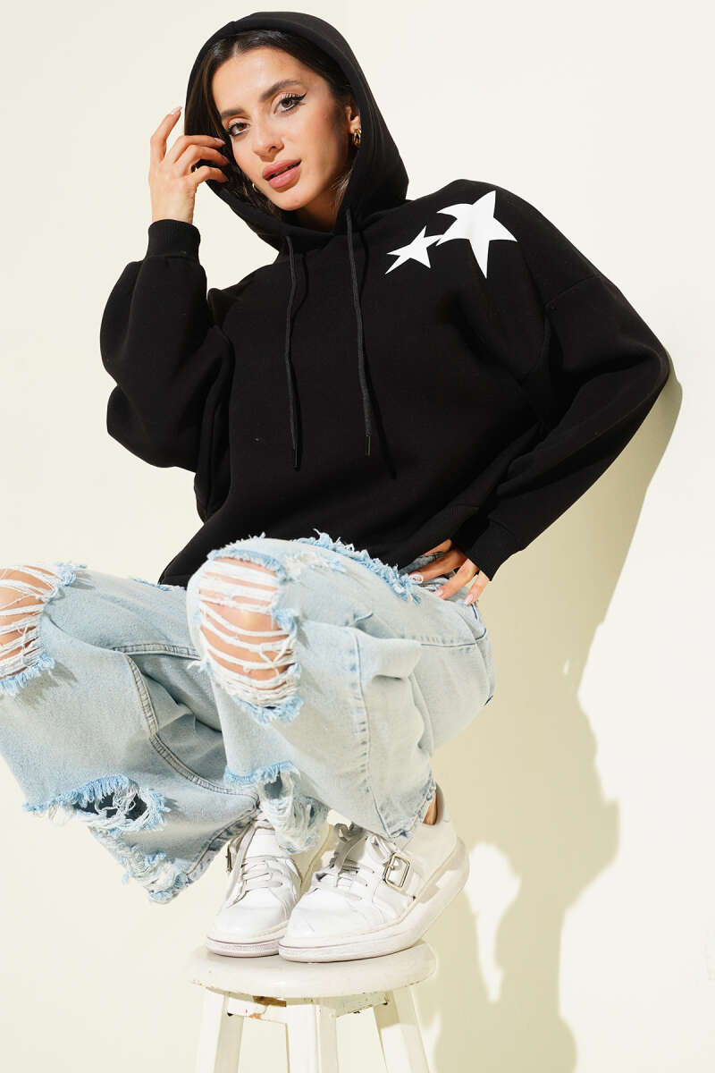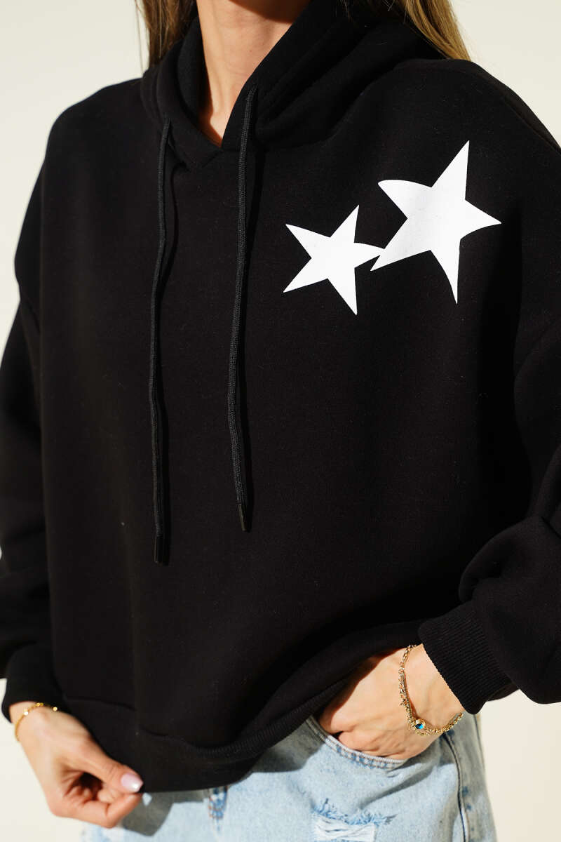 سويت شيرت أسود مع قبعة وطباعة نجوم