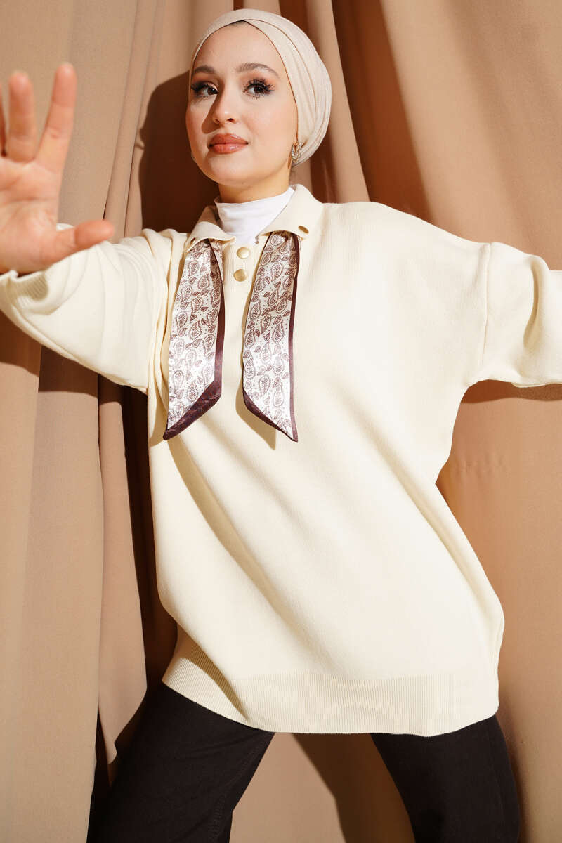 تونك محبوك بلون الحجر بياقة قميص ووشاح