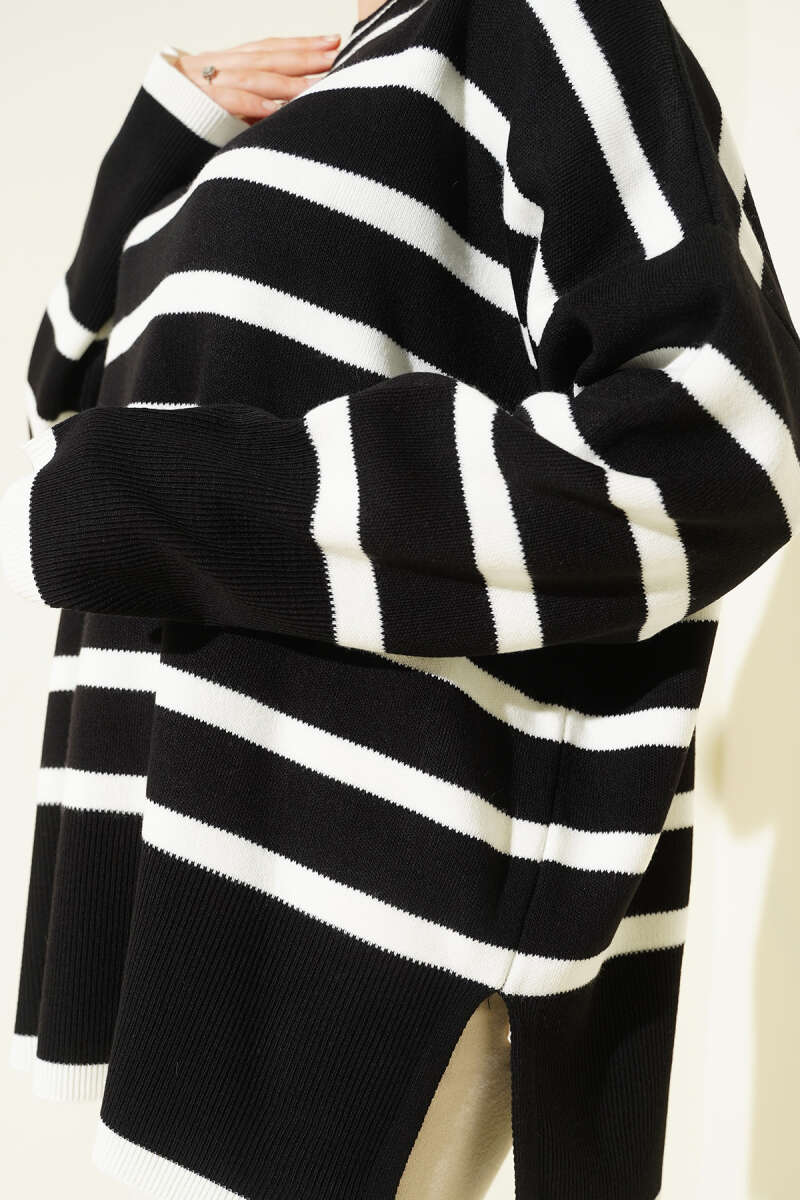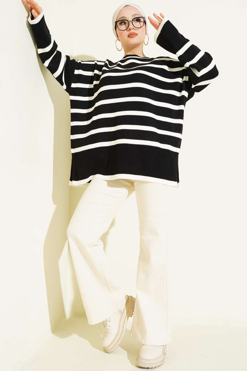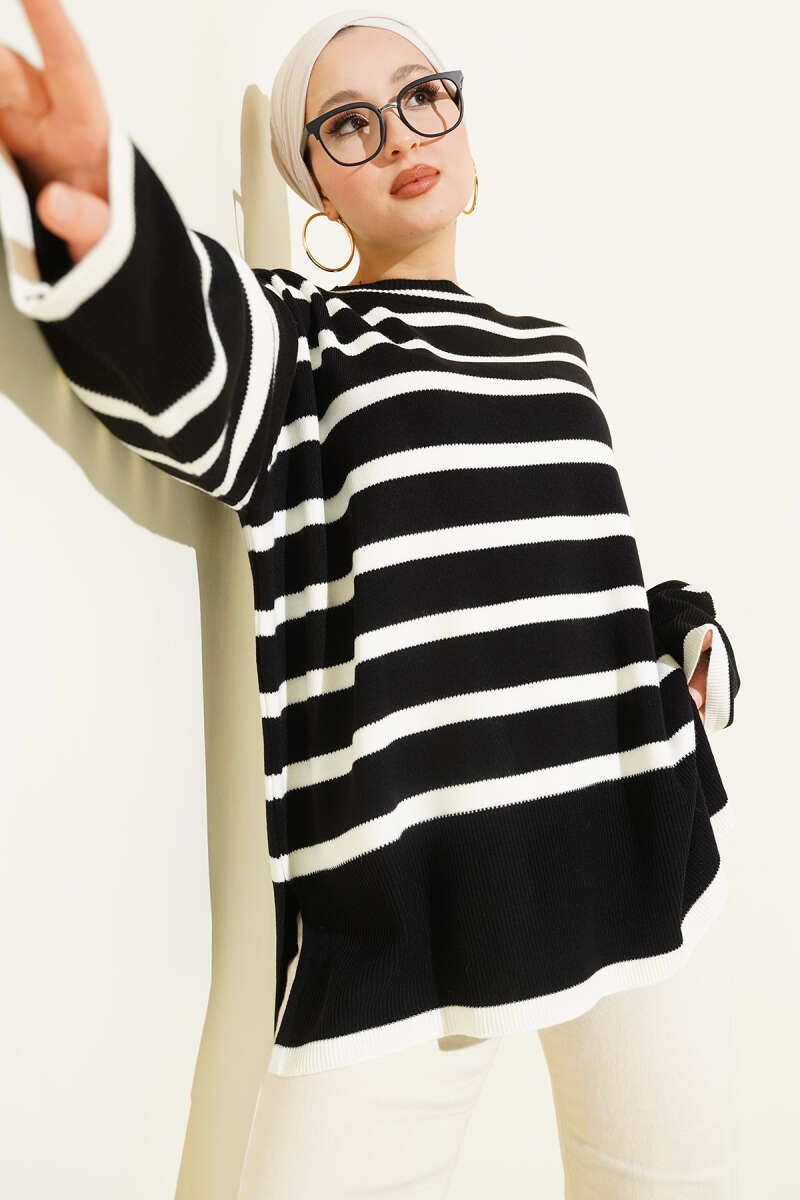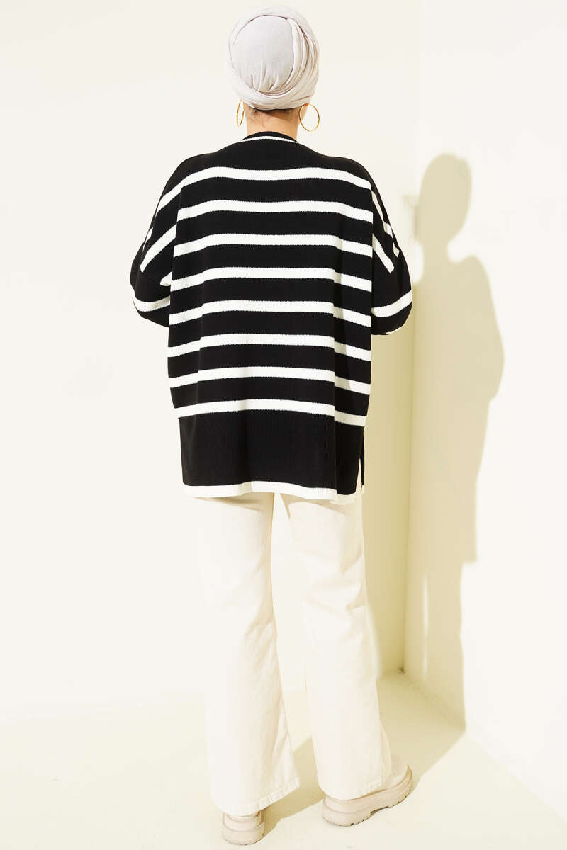 كنزة صوفية مخططة بسحاب جانبي أسود