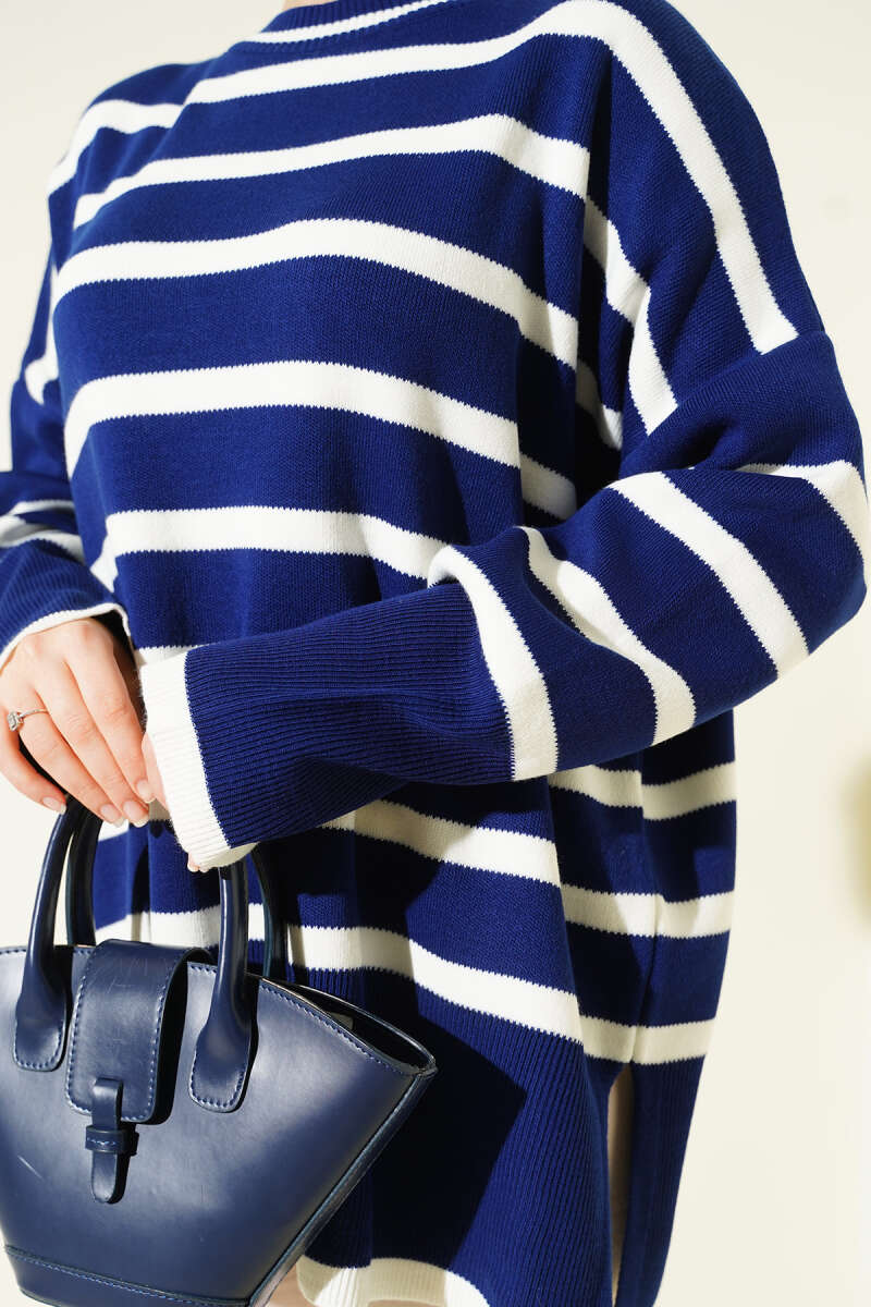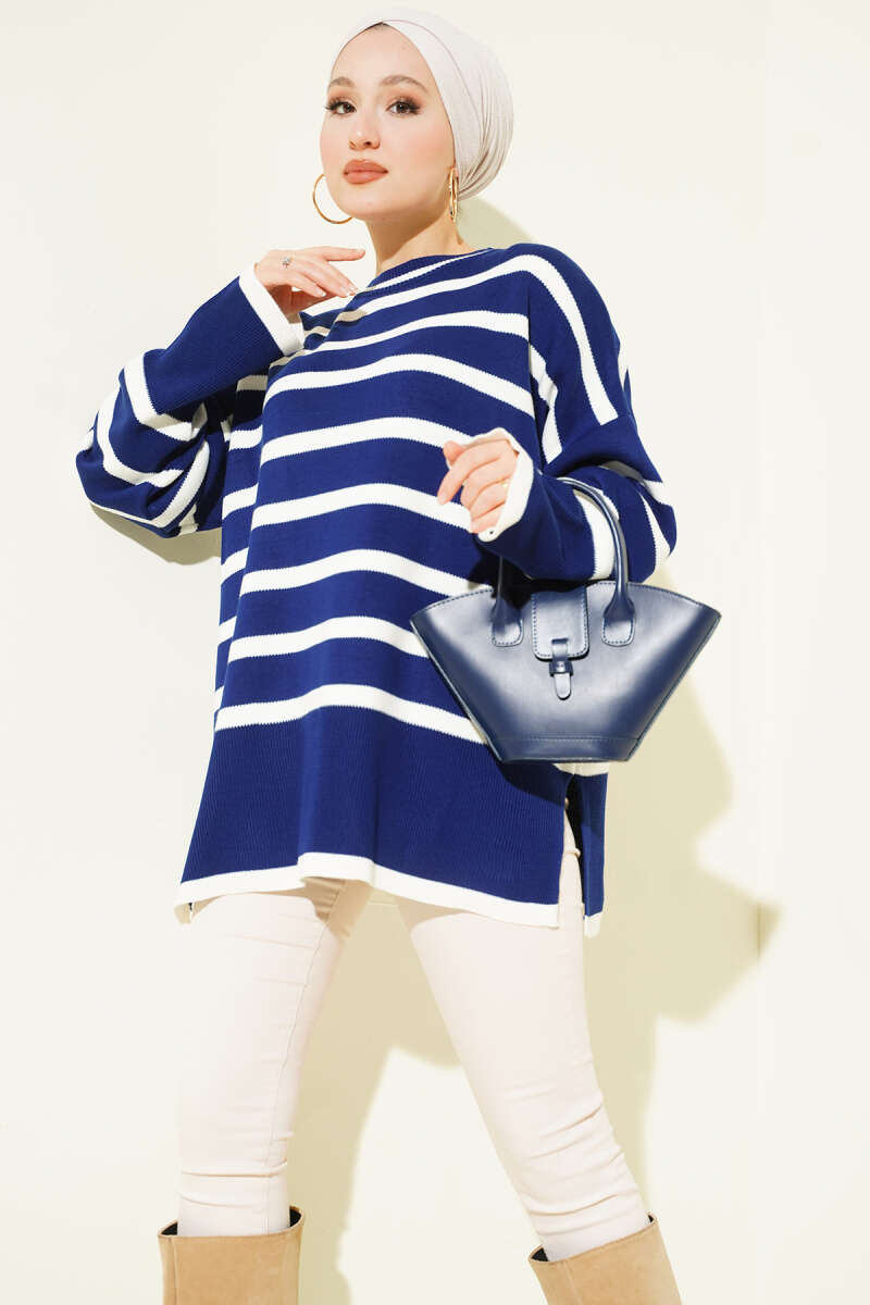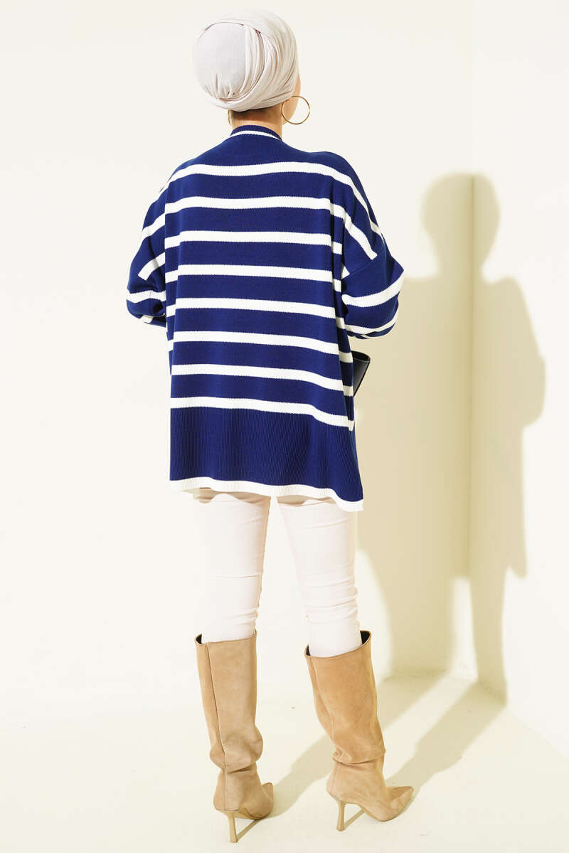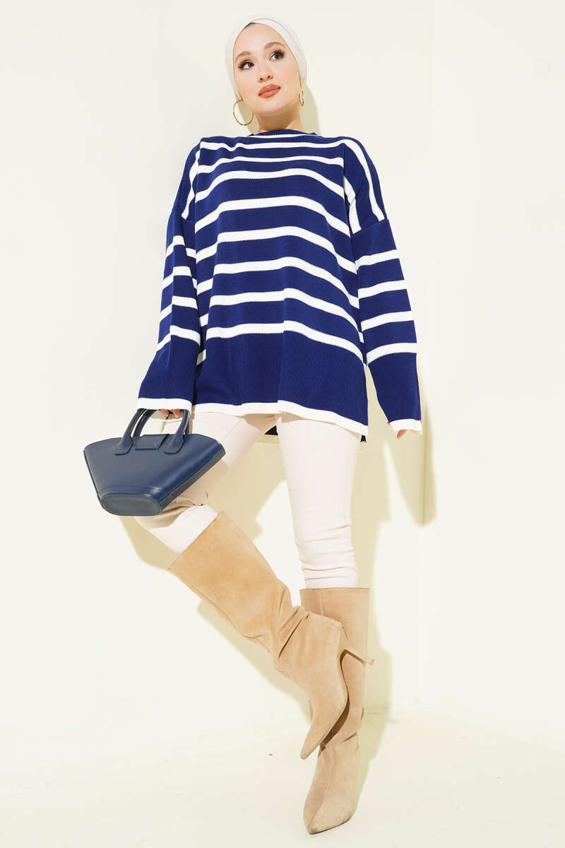 كنزة صوفية مخططة بياقات جانبية باللون الأزرق الداكن