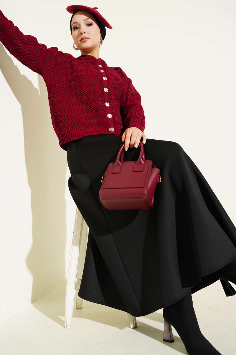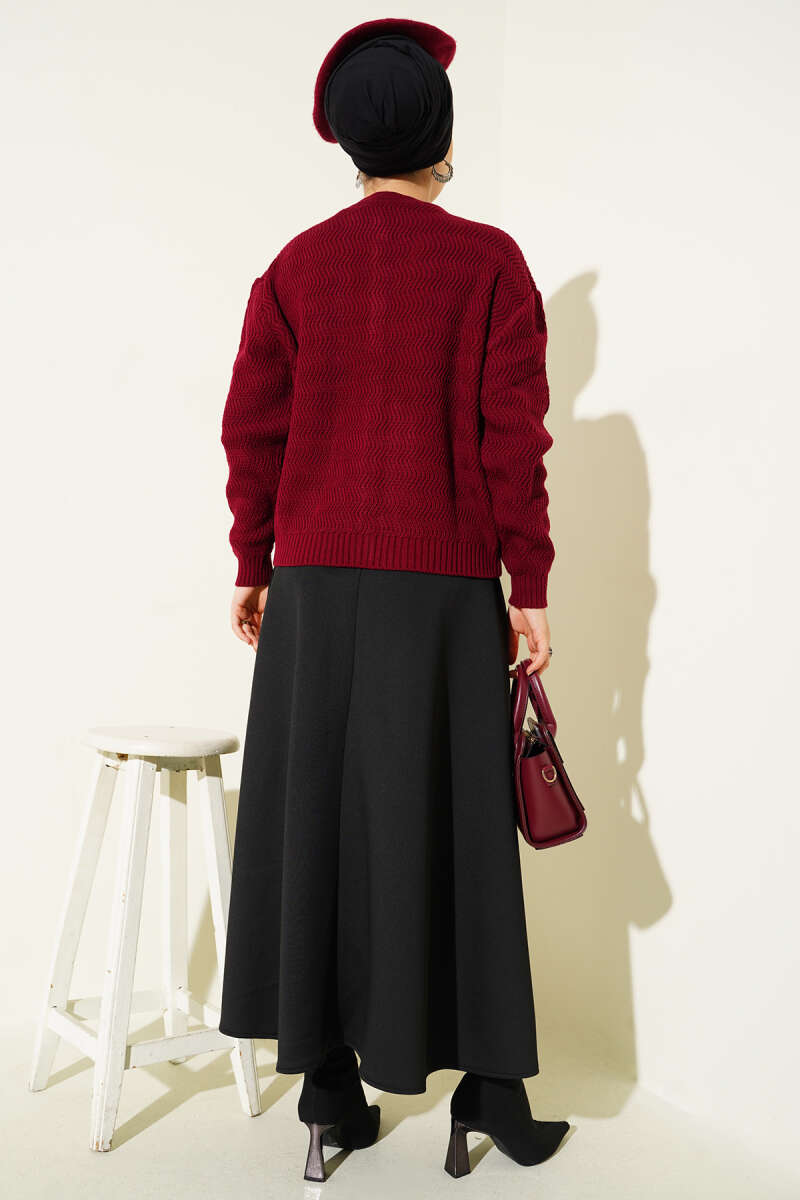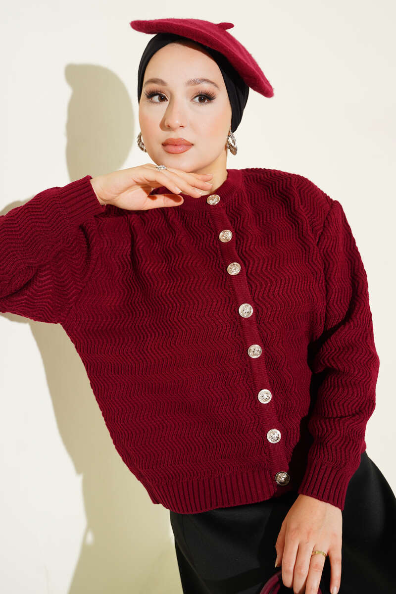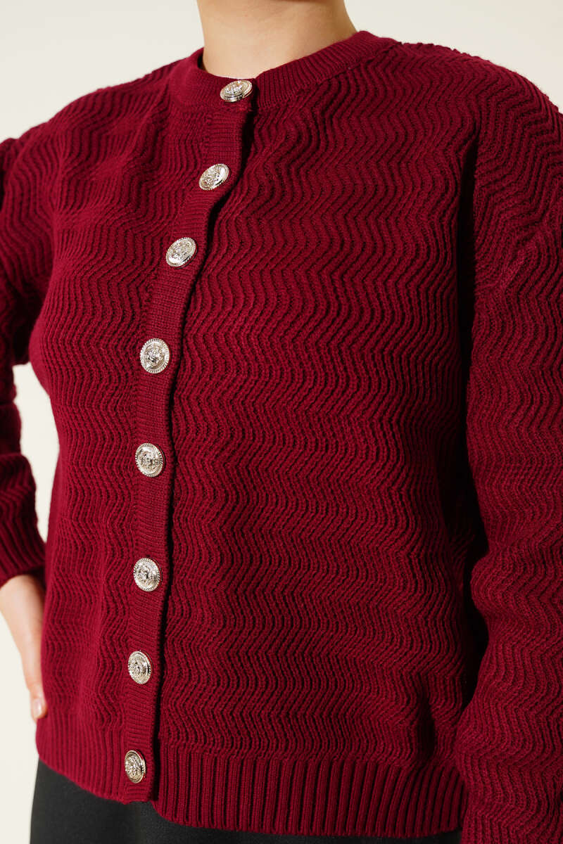 Burgundy Knit Cardigan with Gold Button and Zigzag Pattern