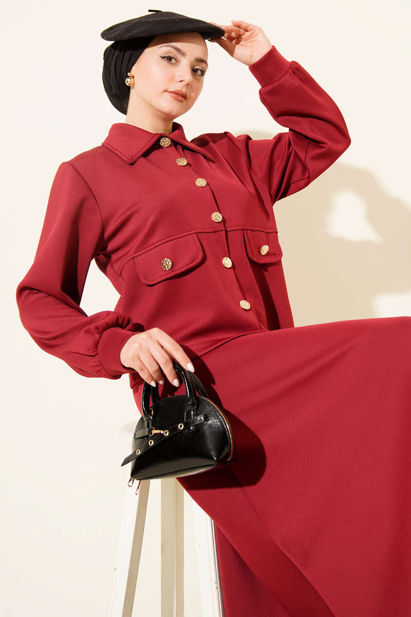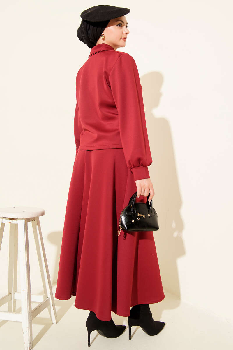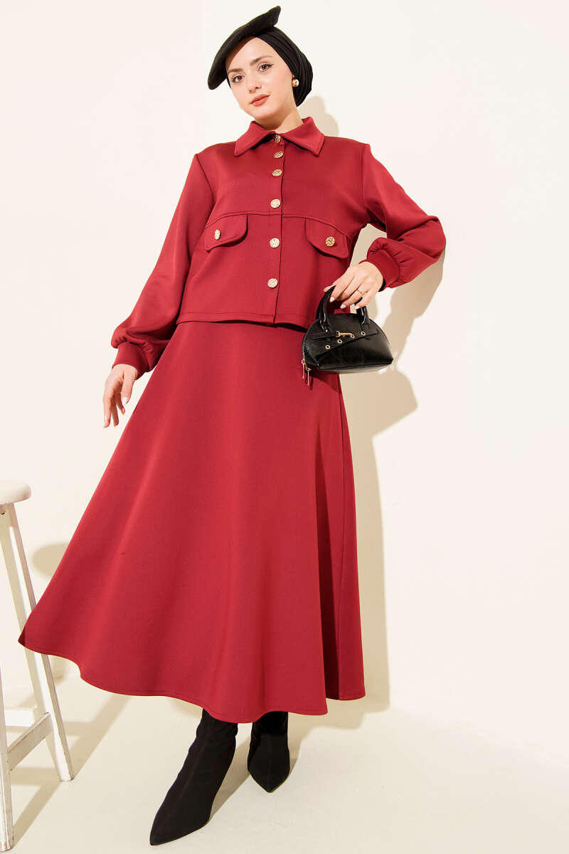 Buttoned Fake Pocket Scuba Skirt Set in Burgundy