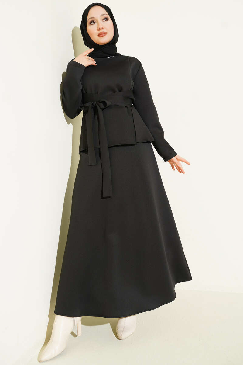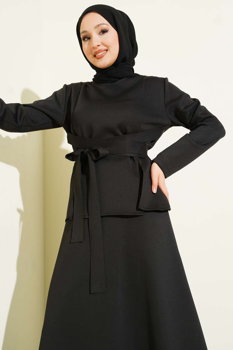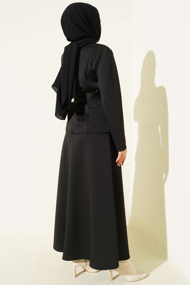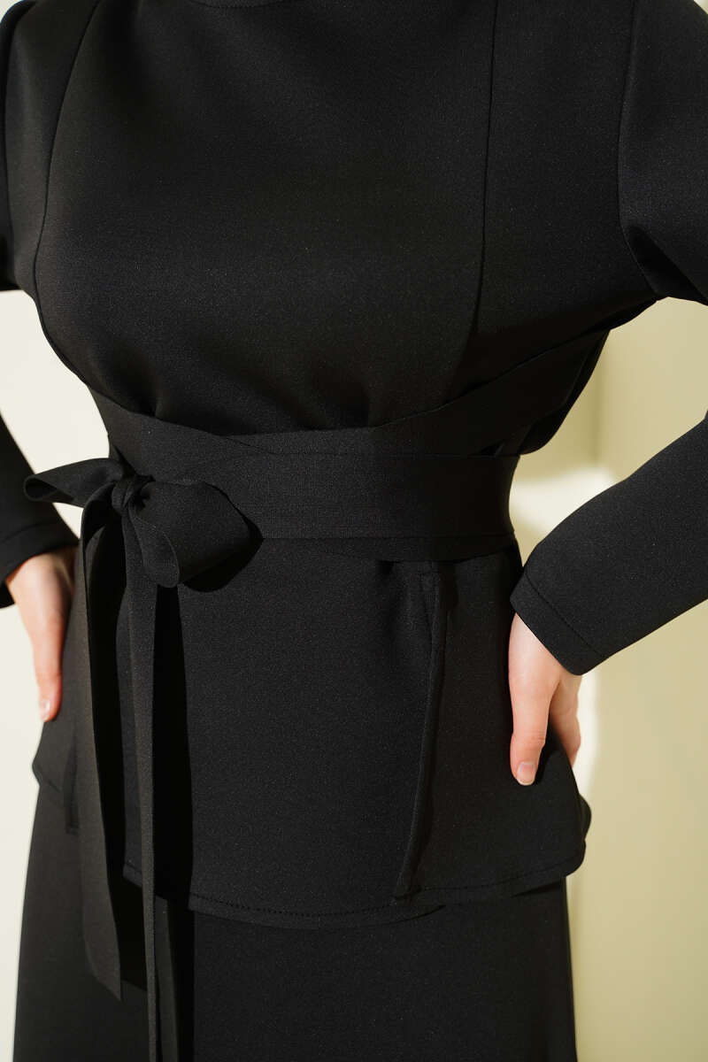Detailed Belted Scuba Two-Piece Skirt Set - Black