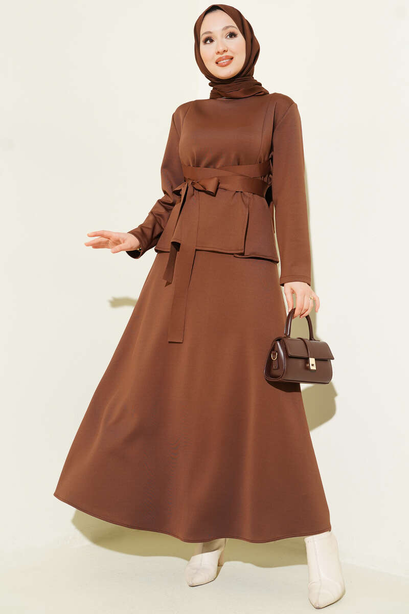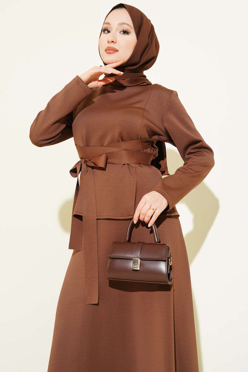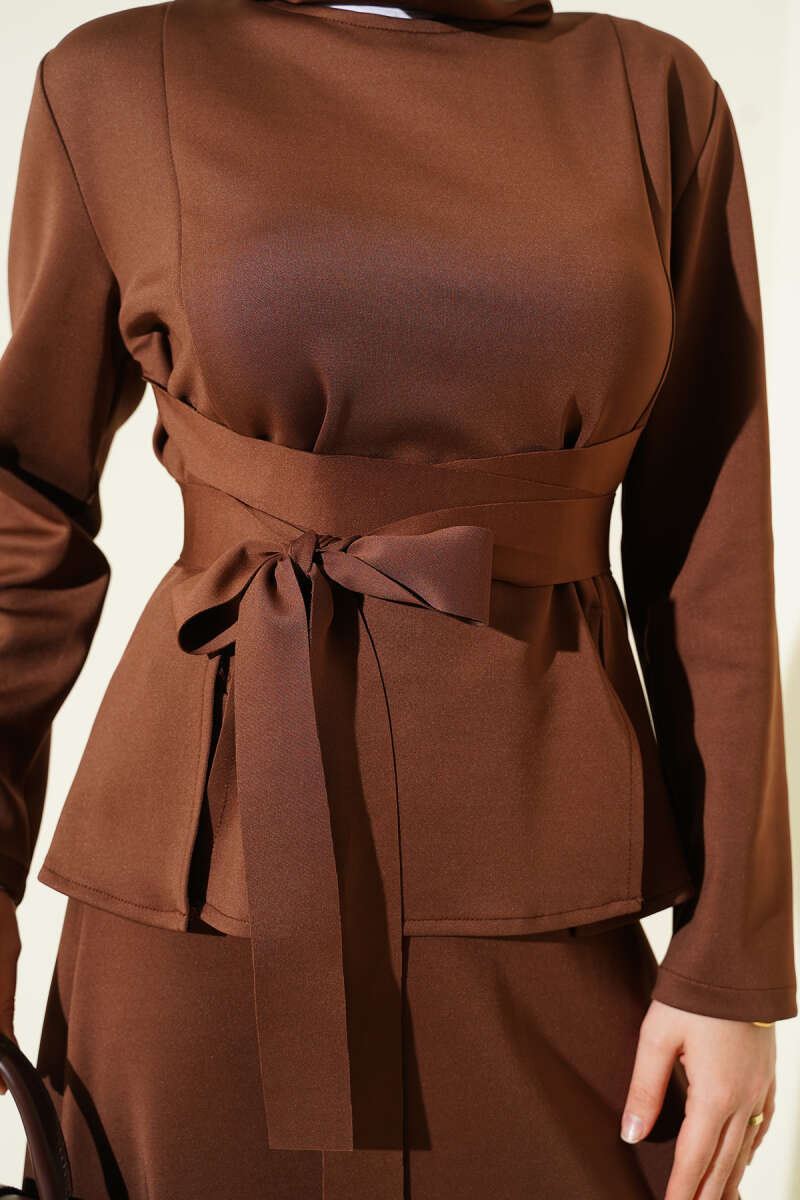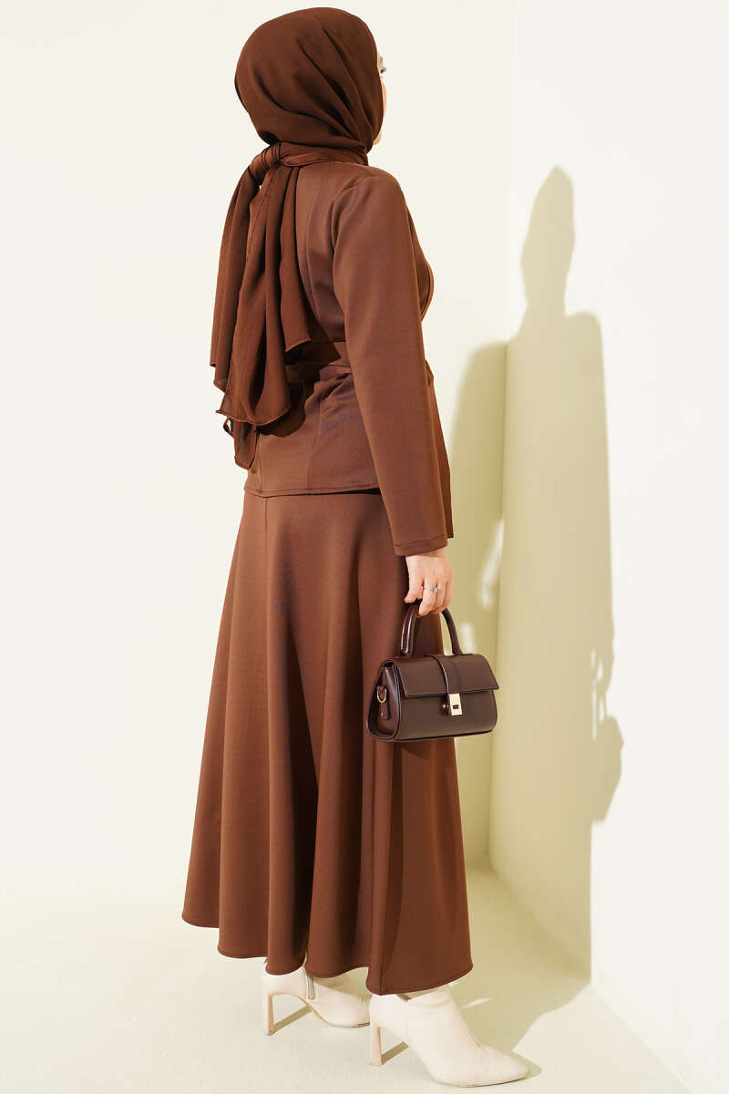 Detailed Belted Scuba Two-Piece Skirt Set in Brown