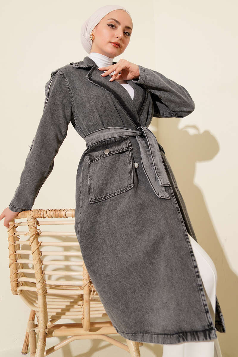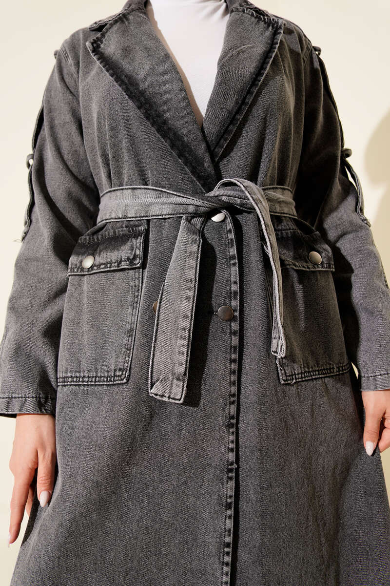 Double-Breasted Waist-Tied Denim Trench Coat in Dark Grey