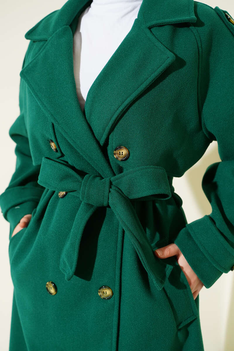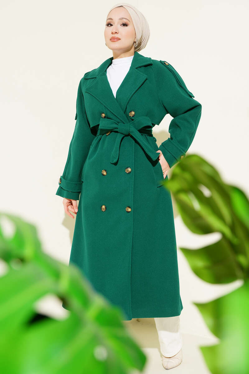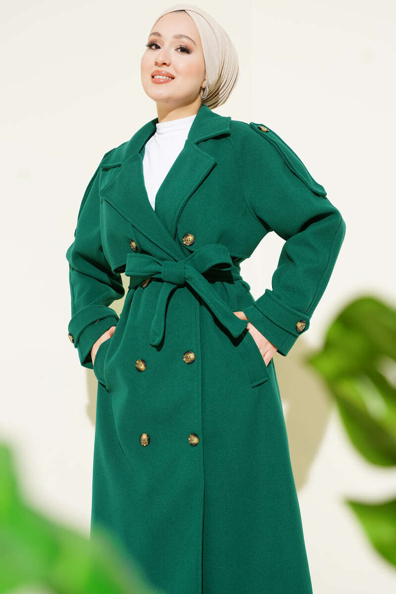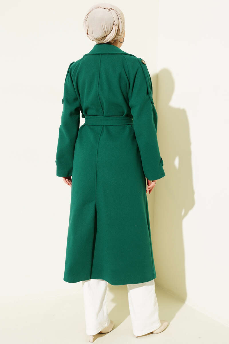 Emerald Wool Coat with Shoulder Epaulettes and Button Details