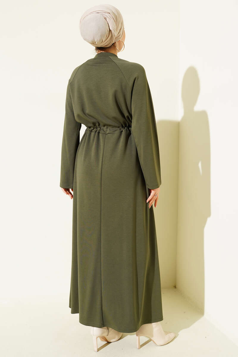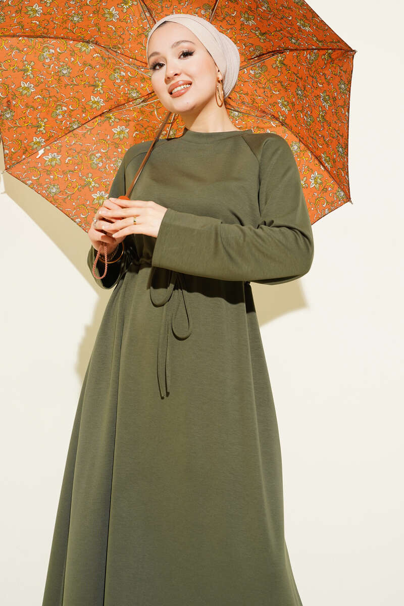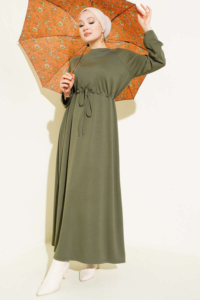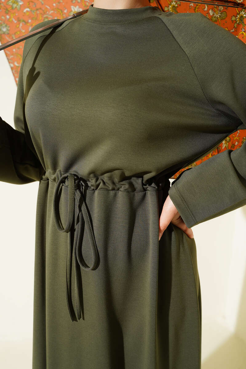 Hooded Waist Tunnel Detail Dress in Olive Green