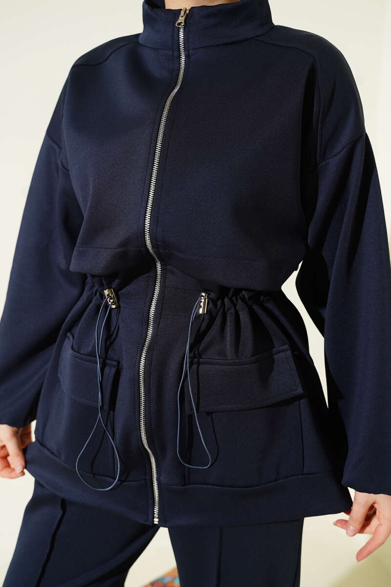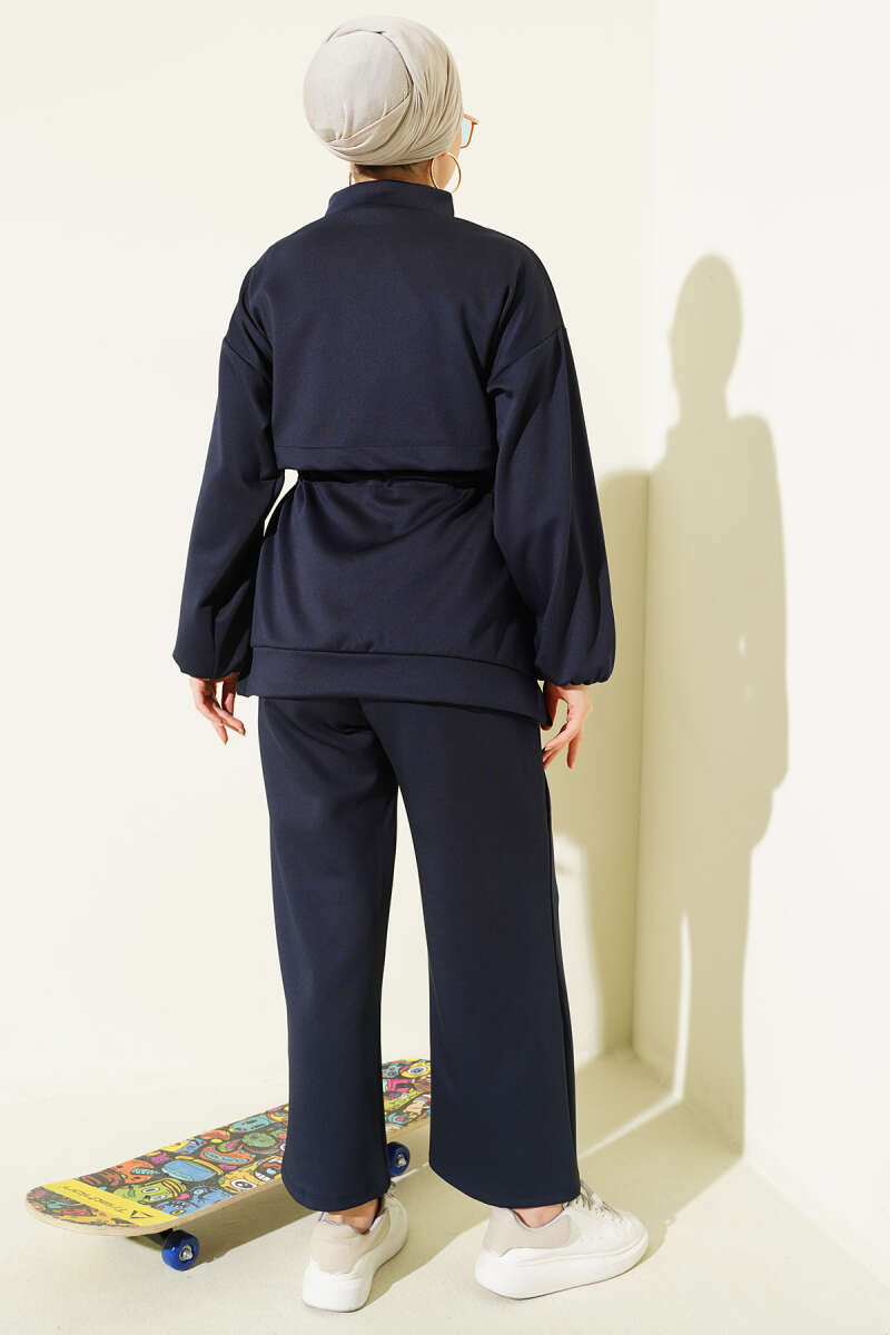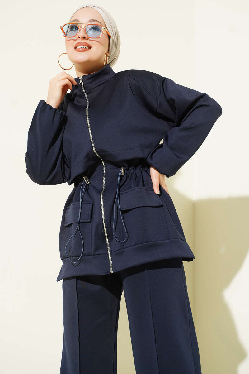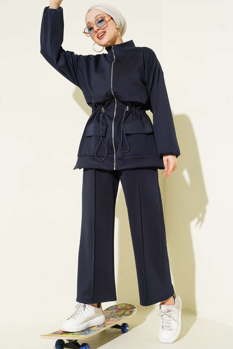 Navy Blue Bel Tünelli Pocket Scuba Two-Piece Set