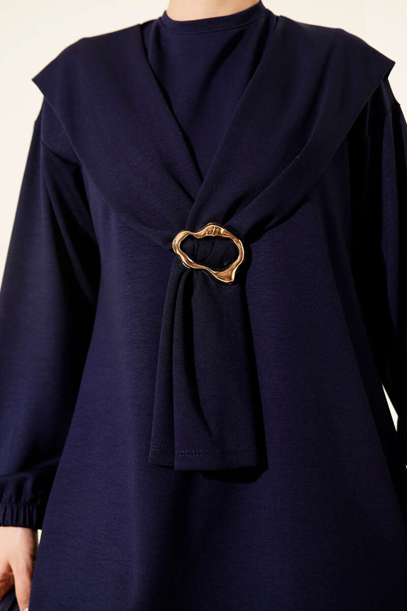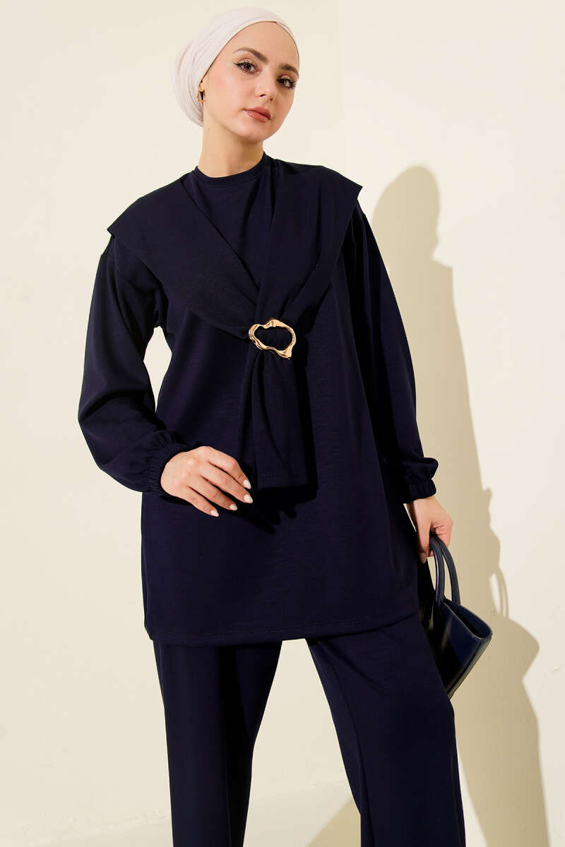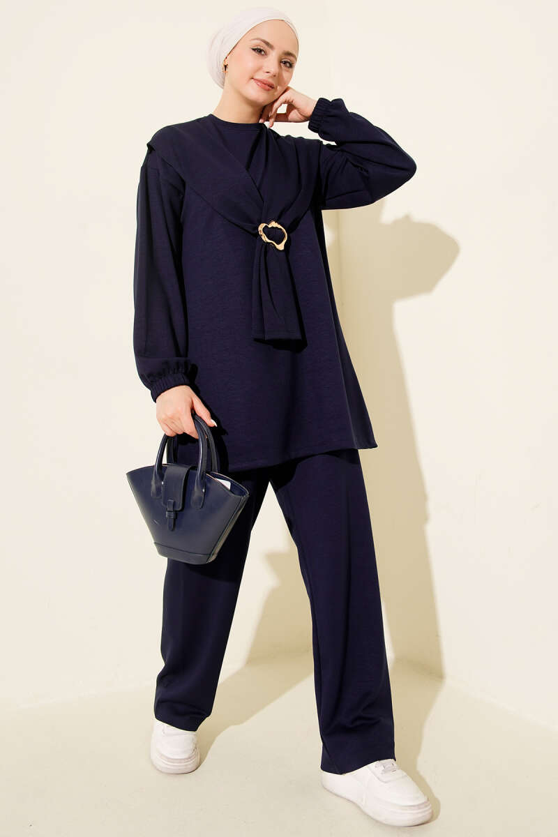 Navy Blue Two-Piece Set with Gold Buckle and Scarf