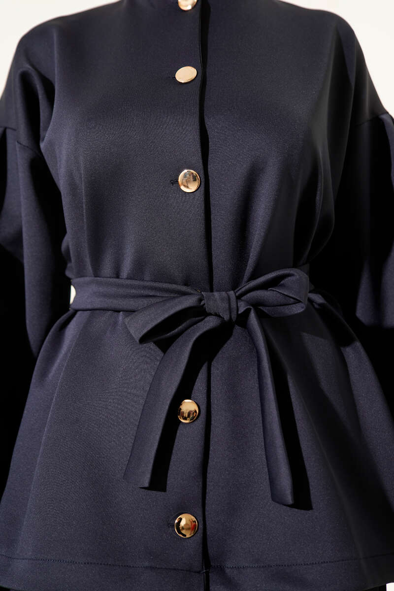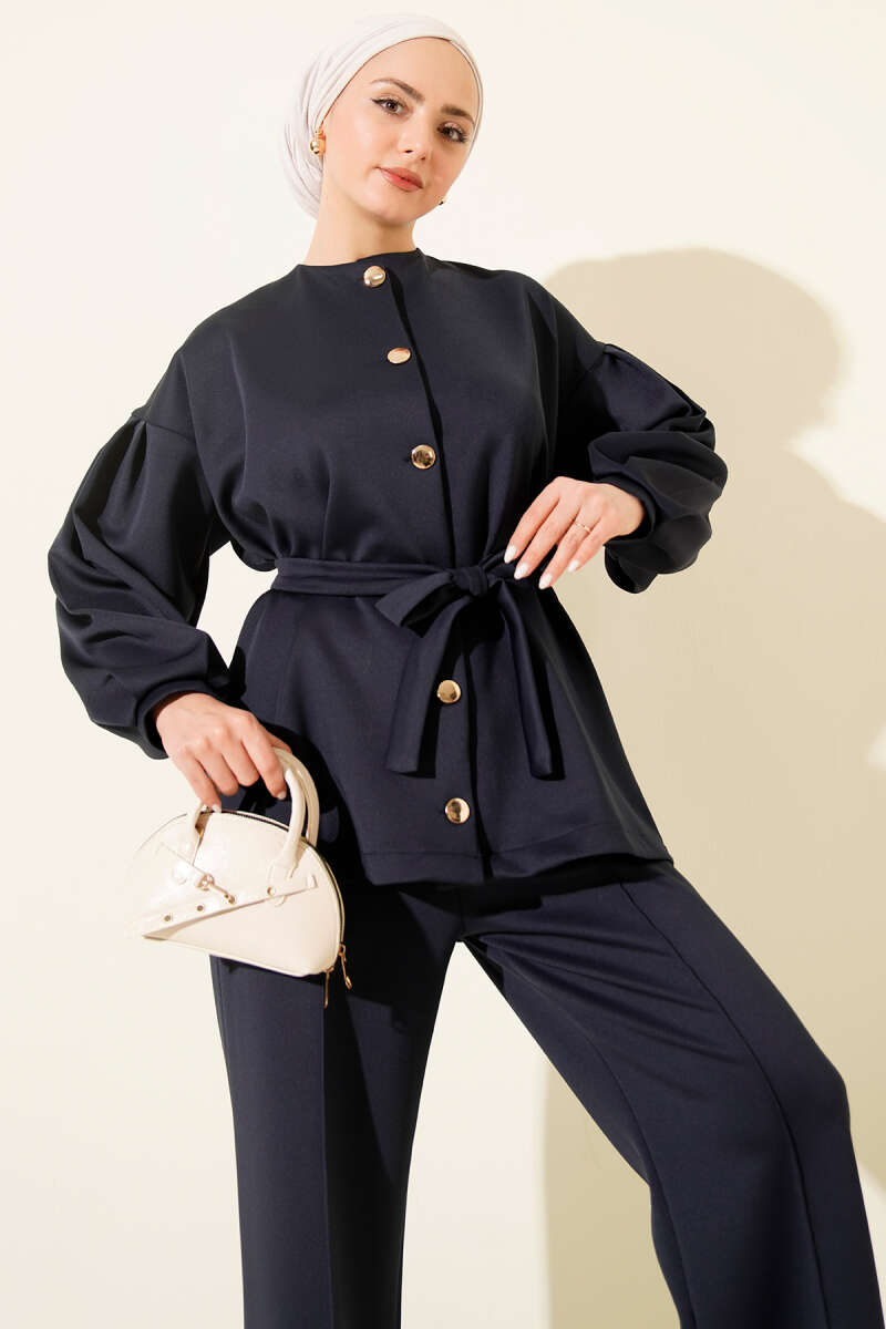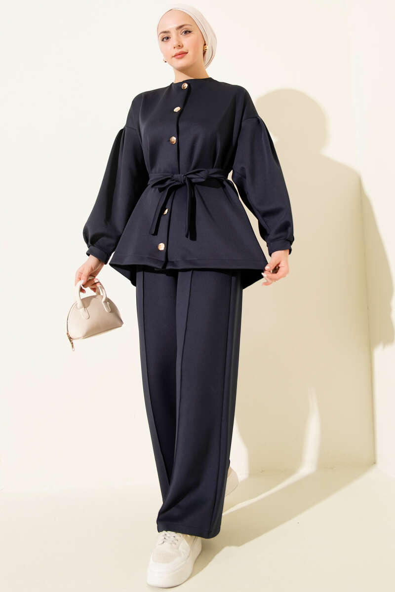 Navy Blue Two-Piece Set with Metal Buttons and Belt