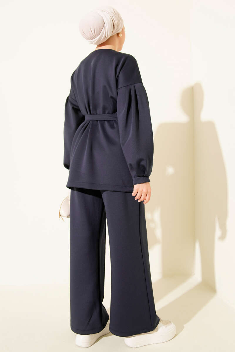 Ayrobin Two-Piece Suit with Shoulder Epaulets and Long Cardigan in Indigo