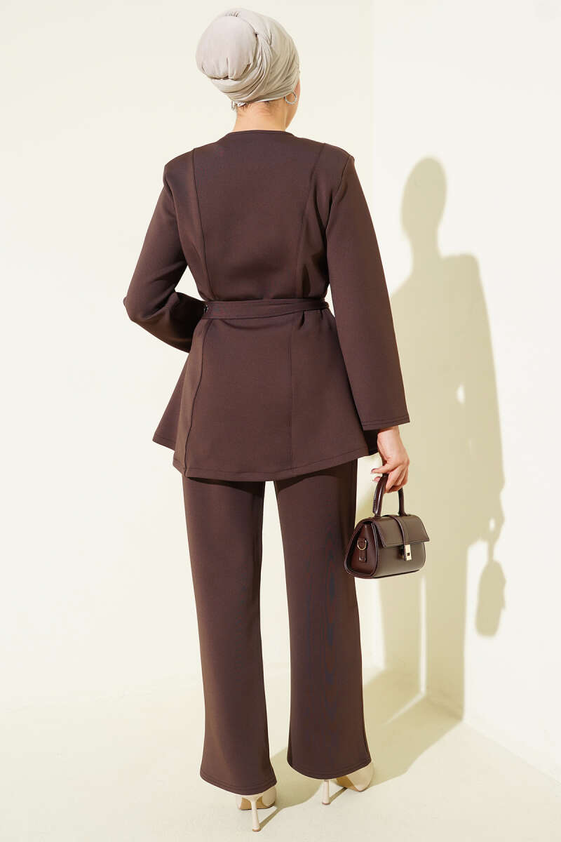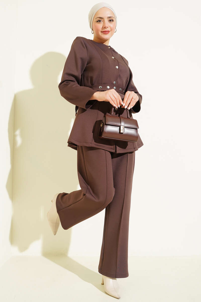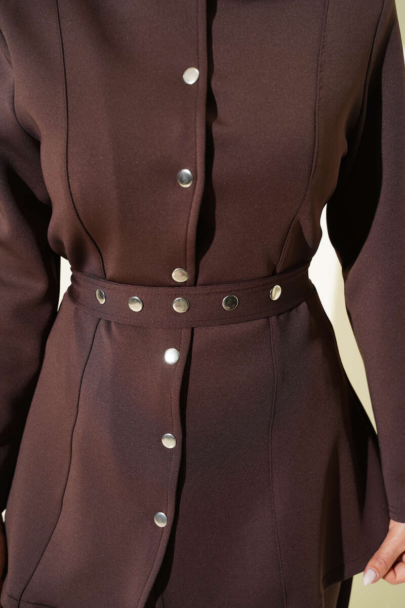 Two-Piece Brown Jacket Set with Belt and Snap Buttons
