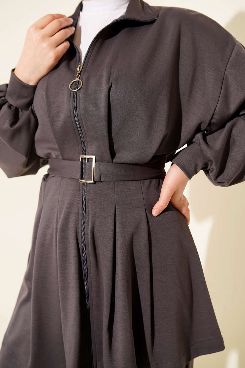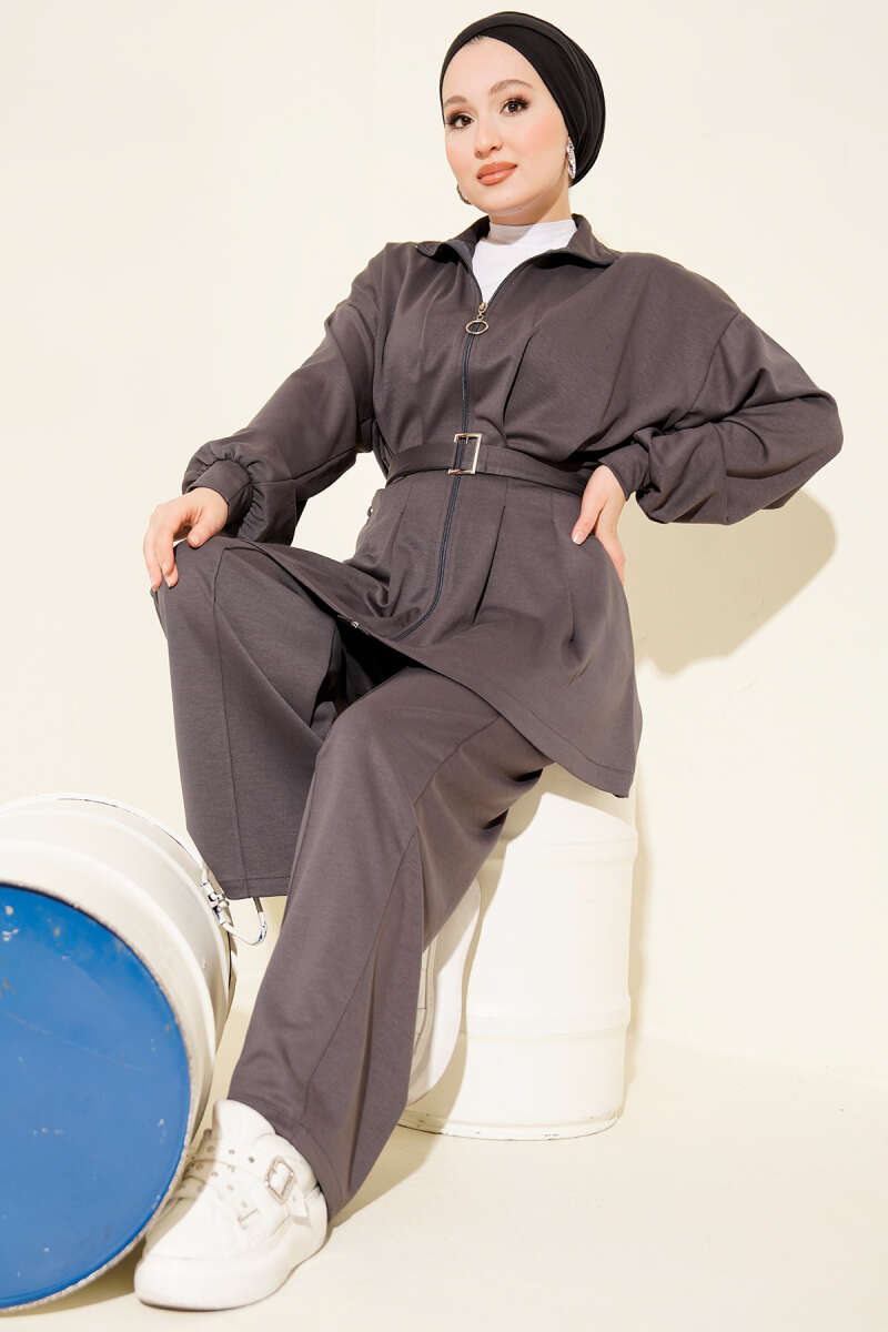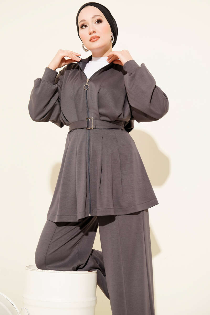 Zipped Hooded Oysho Set with Belt - Charcoal